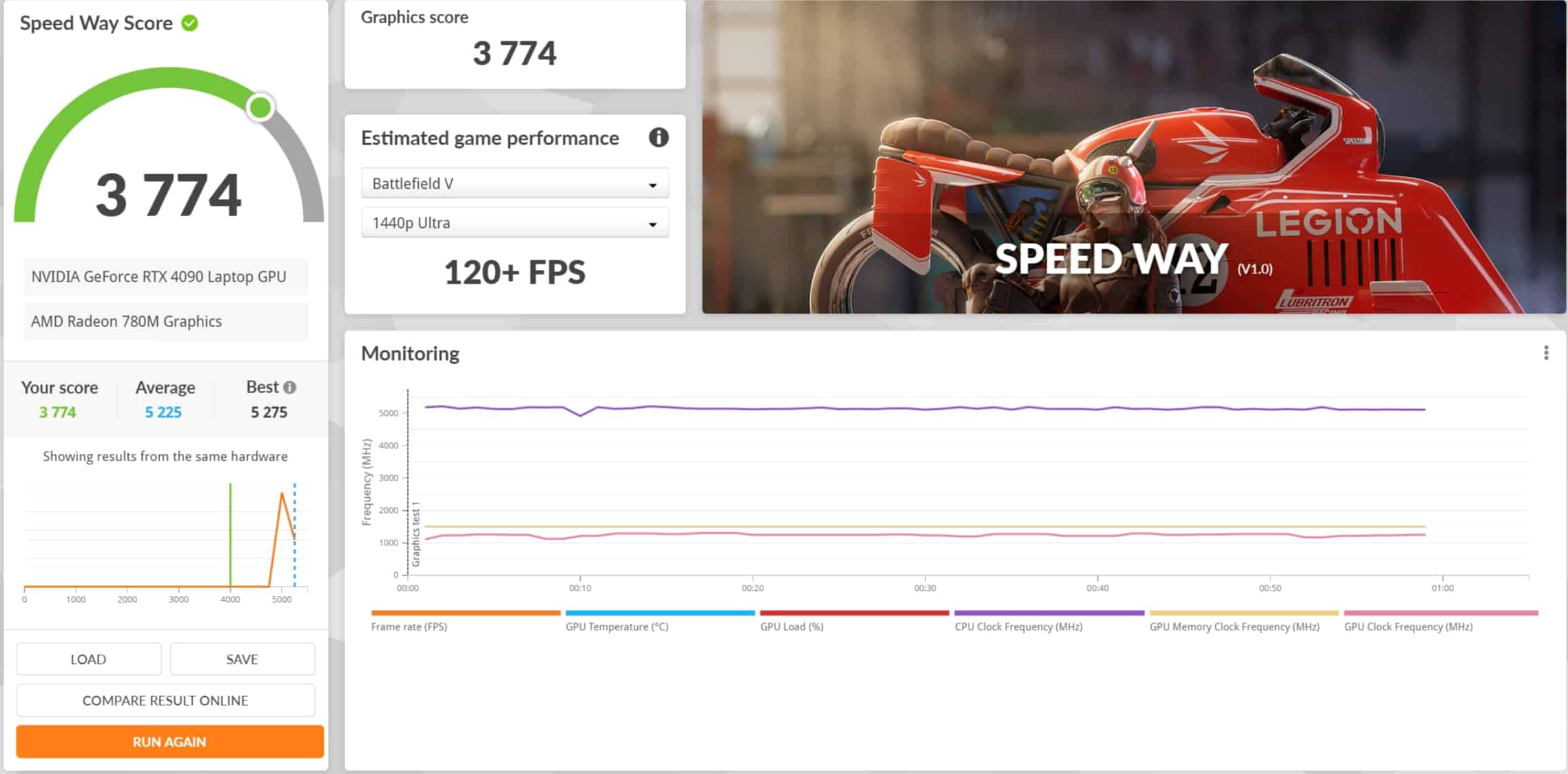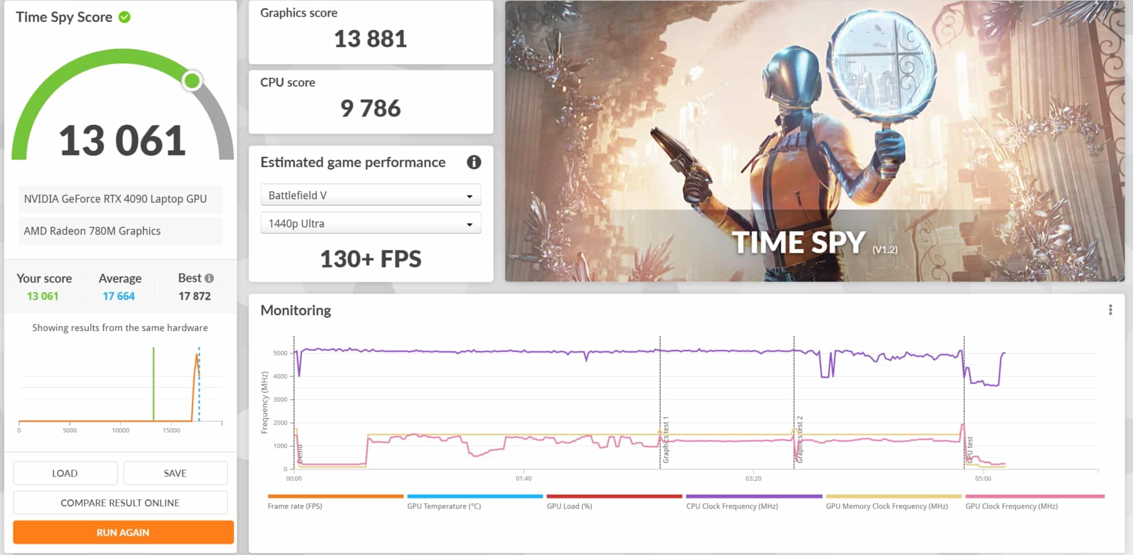 Mit einer maximalen TDP von 125 Watt – inklusive Dynamic Boost – ist die verbaute RTX 4090 auf dem Papier schwächer als dasselbe Modell im ROG Zephyrus M16 und hat ganze 50 Watt weniger Power zur Verfügung als die RTX 4080 im Omen 17. Dennoch kann die 3D- und Gaming-Leistung in meinen Augen vollends überzeugen.