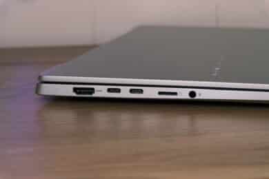 Hinsichtlich der Anschlüsse ist das ASUS Vivobook S 15 sehr gut aufgestellt. Auf der linken Seite stehen HDMI 2.1, zweimal USB-C 4.0 (mit 40 GBit/s, DisplayPort-Alt-Modus und PowerDelivery), ein microSD-Kartenleser und ein 3,5-mm-Klinkenanschluss zur Verfügung.
