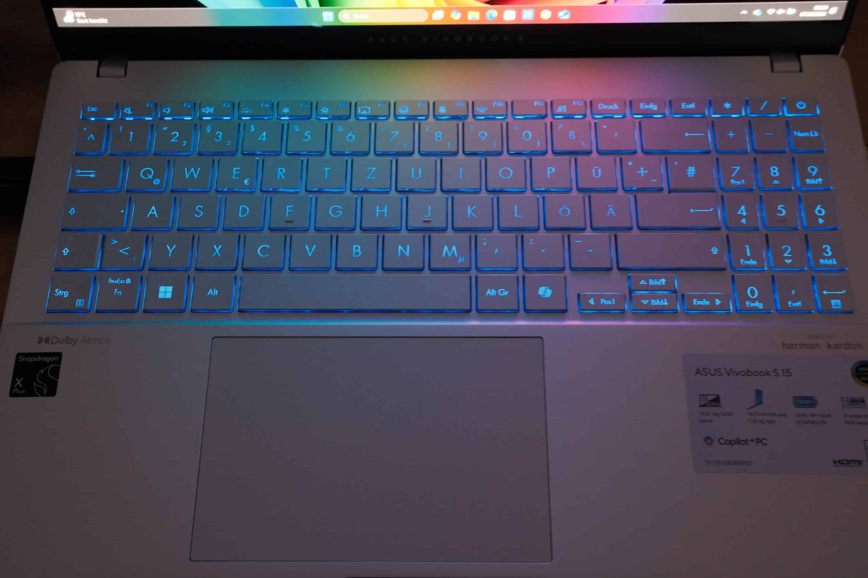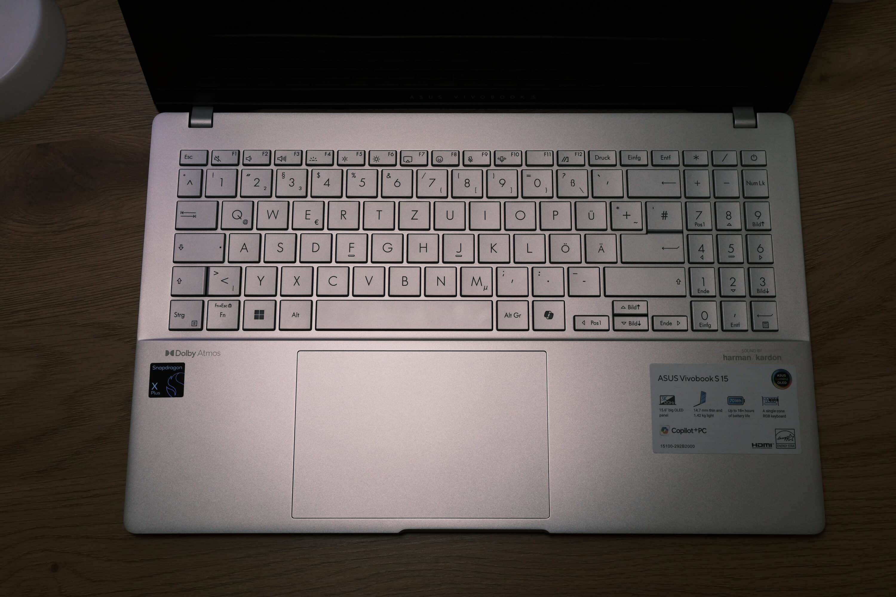 Auf dem Displaydeckel findet sich der Vivobook-Schriftzug, während ein Qualcomm-Aufkleber innen den einzigen optischen Unterschied zur Windows-Variante darstellt. Auch die Verarbeitungsqualität ist sehr hochwertig und edel. Alles in allem erhaltet ihr hier ein wirklich wertiges Notebook für vergleichsweise wenig Geld.
