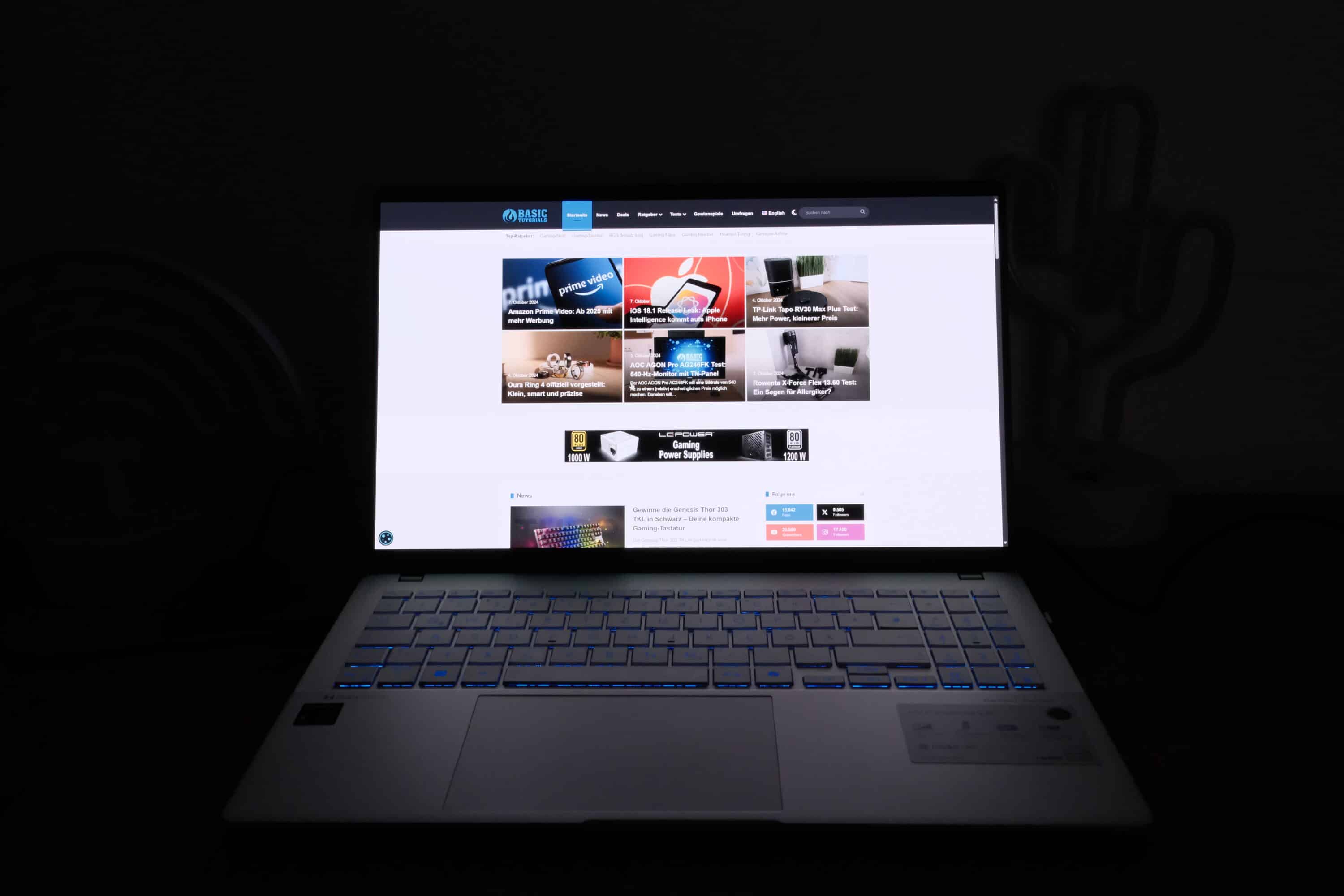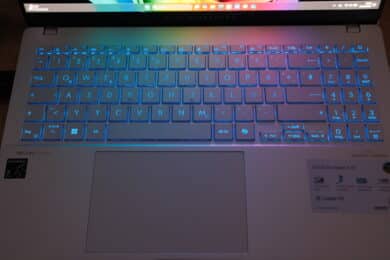 Die silberfarbene Tastatur kommt mit einem Nummernblock daher und erstreckt sich über die gesamte Breite des Laptops. Außerdem gibt es eine RGB-Beleuchtung in einer Zone. Bedeutet: Die Tasten leuchten zwar bunt und das in verschiedenen Effekten, aber eben alle gleichzeitig in derselben Farbe. Dafür lässt sich die Helligkeit der Beleuchtung in drei Stufen anpassen.