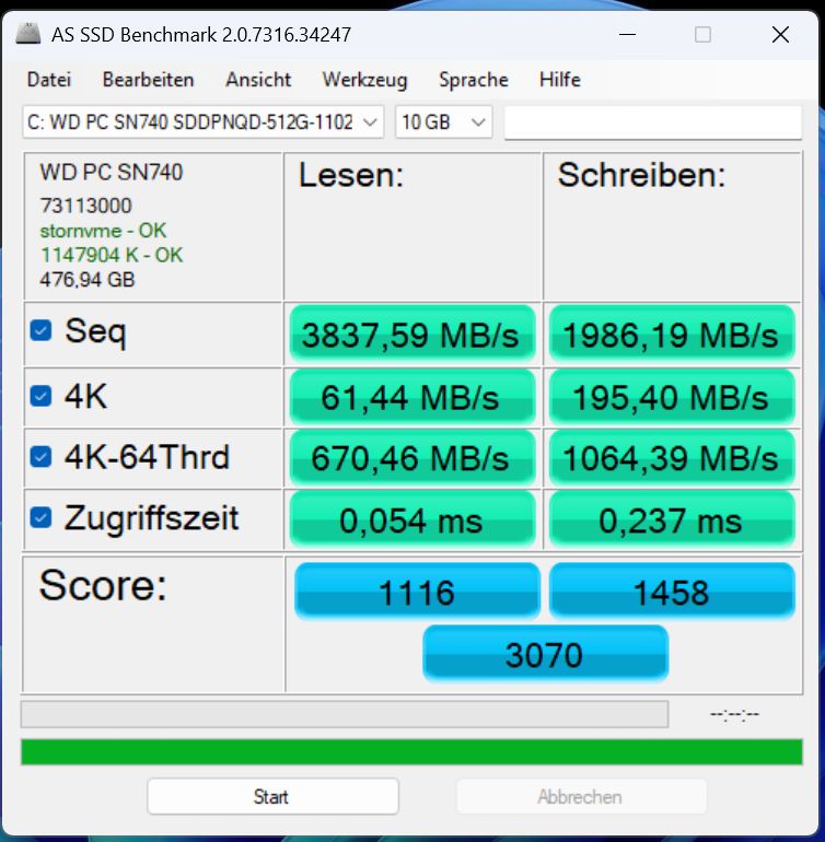 Beginnen wir also mit dem SSD-Benchmark AS-SSD. Die verbaute SSD stammt aus dem Hause Western Digital und liefert, trotz PCIe 4.0 x4-Anbindung, eher enttäuschende Resultate. Im Praxisalltag merkt man davon aber kaum etwas, denn für alltägliche Aufgaben ist der verbaute Speicher schnell genug. Zumal die Leistung auch konstant aufrechterhalten werden kann.