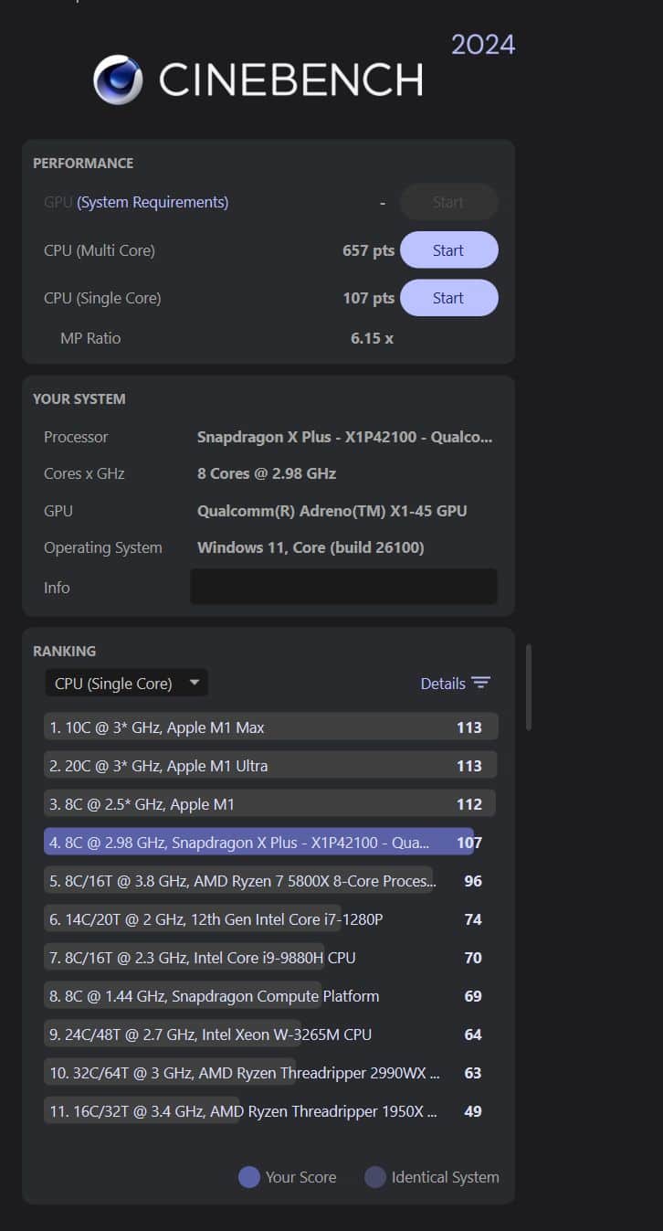 Die Ergebnisse lassen sich also nur bedingt mit klassischen x86-Notebooks vergleichen. Das nur vorab. Allerdings zeigen die Ergebnisse eines ganz klar: Das Snapdragon X Plus kann sich hinsichtlich der Performance nicht von Intel- und AMD-Prozessoren abheben. Gelegentlich leistet sich der Chip zudem einige Ruckler und längere Ladezeiten, die man so von Intel Core Ultra-CPUs oder der AMD Ryzen 7000-Serie nicht gewohnt ist.