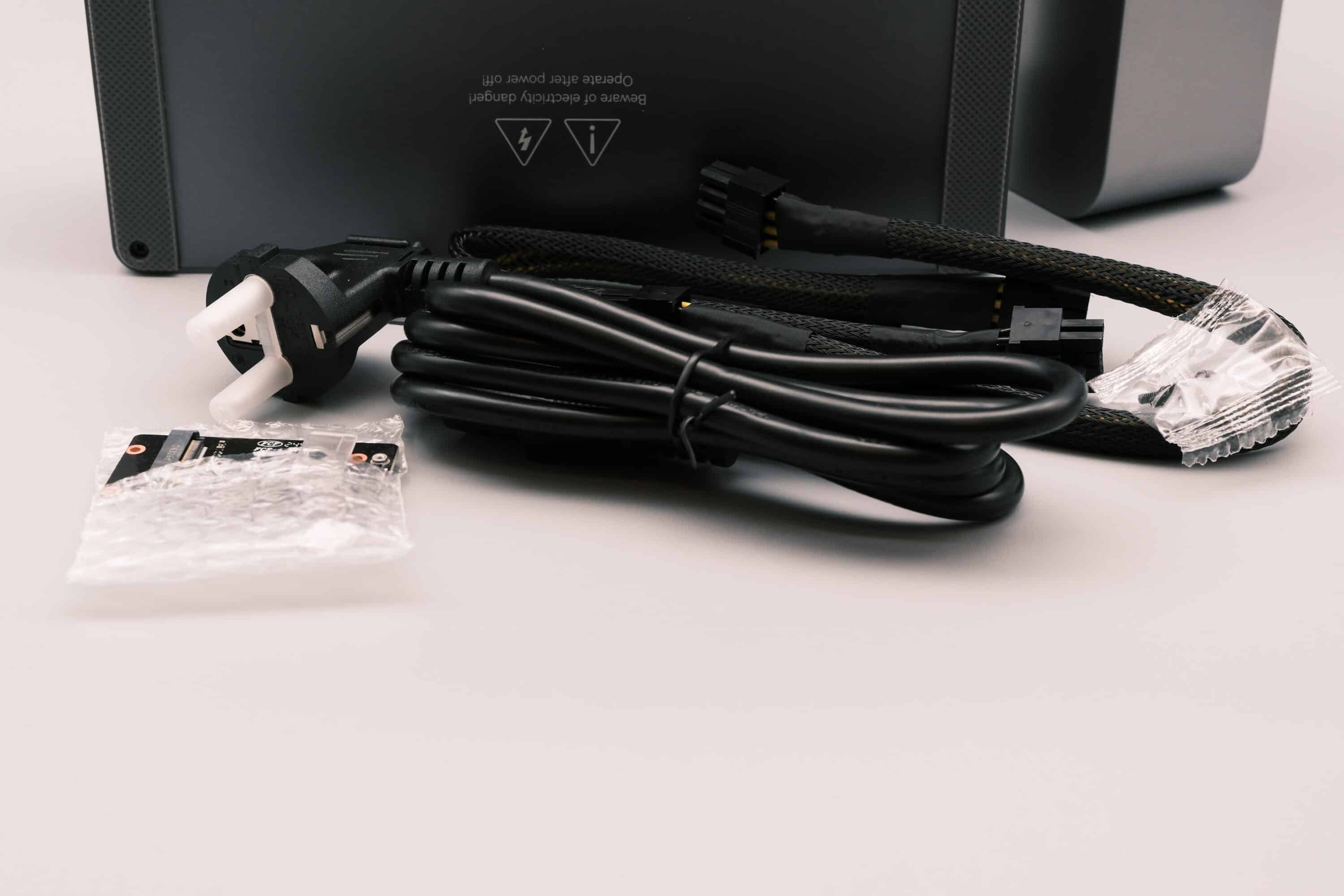 Dafür gibt es ein Netzkabel, ein 3,8-poliges Patchkabel in zweifacher Ausführung, eine Backplate für die Grafikkarte und verschiedene Schrauben (M2, M2,5 und M3).