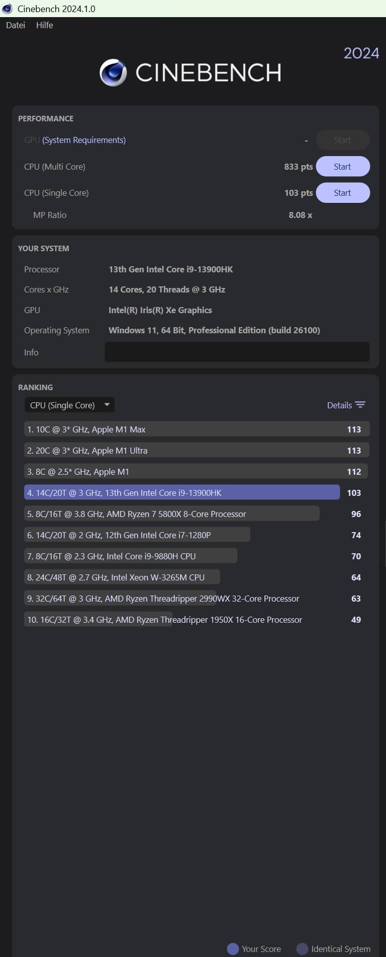 Hinsichtlich der Systemleistung liegt der verbaute Core i9-13900HK auf erwartbarem Niveau und ordnet sich hinter den AMD Ryzen 9-Prozessoren ein. Dennoch liegt die Leistung auf sehr gutem Niveau und ist auch für anspruchsvollere Aufgaben absolut ausreichend.
