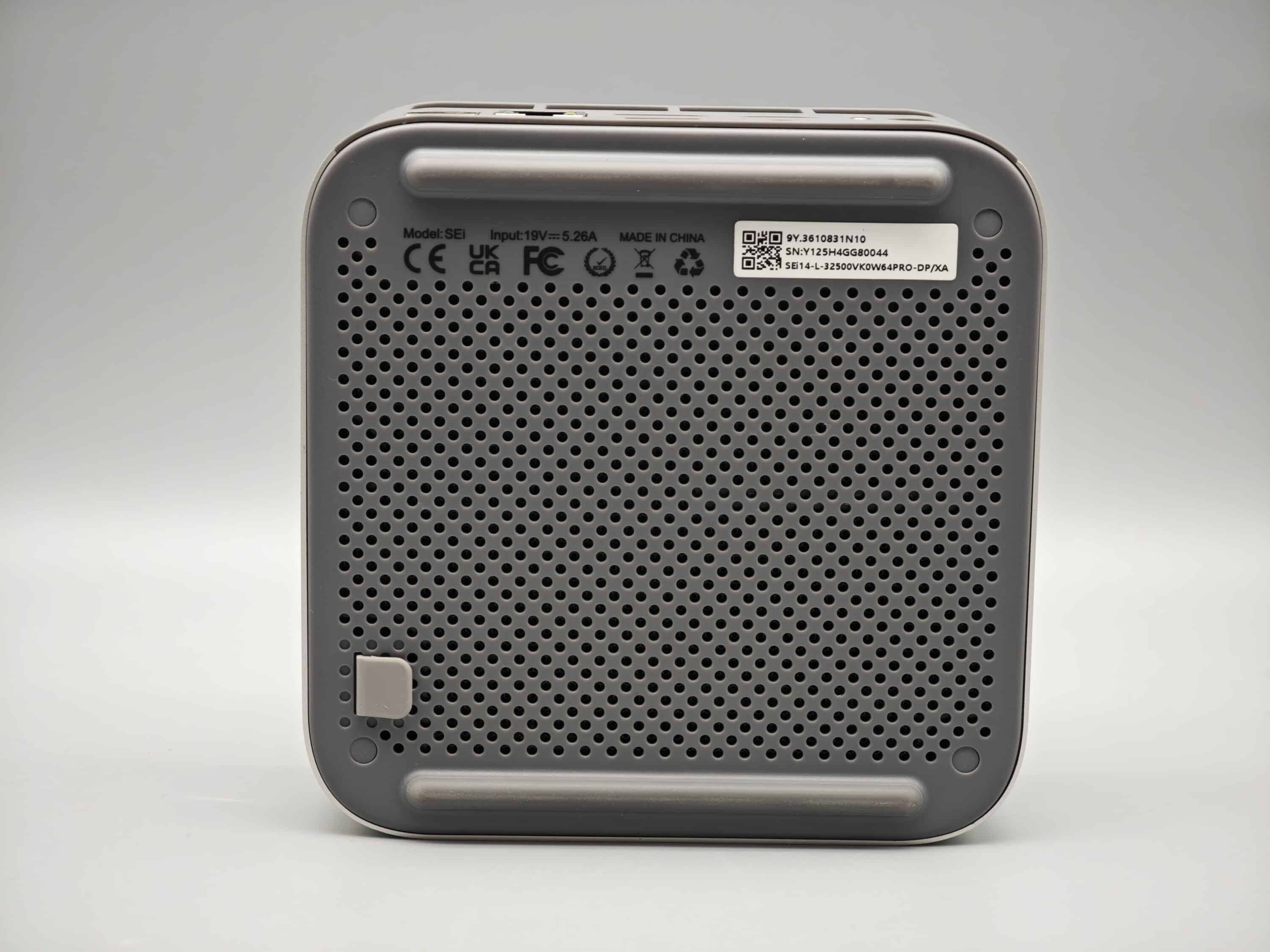 Rein optisch erinnert der SEI 14 an die meisten anderen Mini-PCs. Allerdings verzichtet der Hersteller auf zusätzliche Lüftungslöcher an den Seiten, was den robusten Eindruck noch einmal verstärkt. Stattdessen gibt es großzügige Lüftungsschlitze an dr Rückseite, sowie eine löchrige Unterseite.