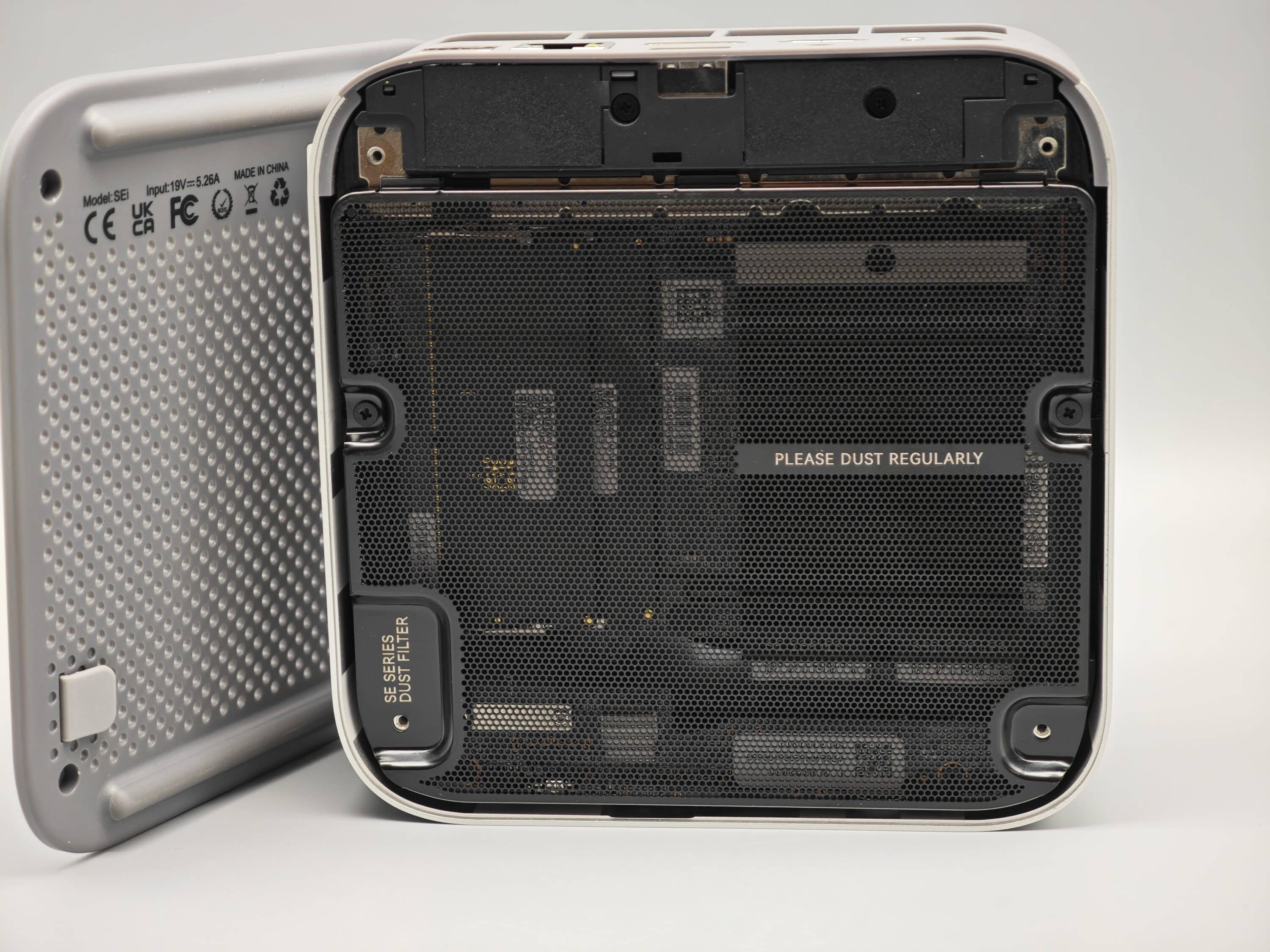 Kluges Detail: Die Unterseite verfügt über ein kleines Gummiband, mit der sie sich leichter herausnehmen lässt. Nicht ganz so klug hingegen, dass sich die Schrauben zum Öffnen des Gehäuses – ähnlich wie beim Geekom A8 (unser Test) unter den geklebten Gummiabdeckungen befinden. Und die lassen recht schwer herausnehmen ohne sie kaputtzumachen, das wäre nicht nötig gewesen.