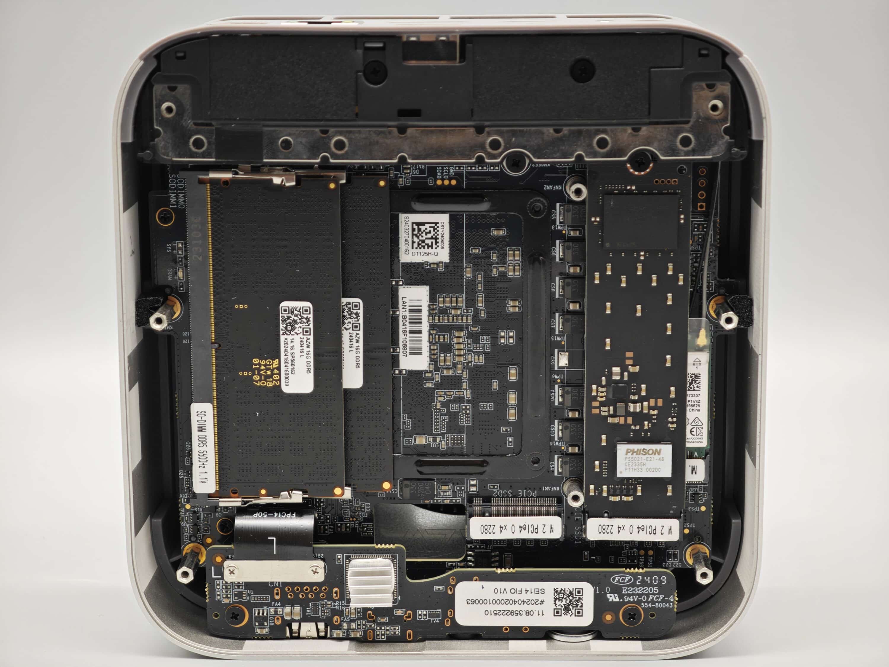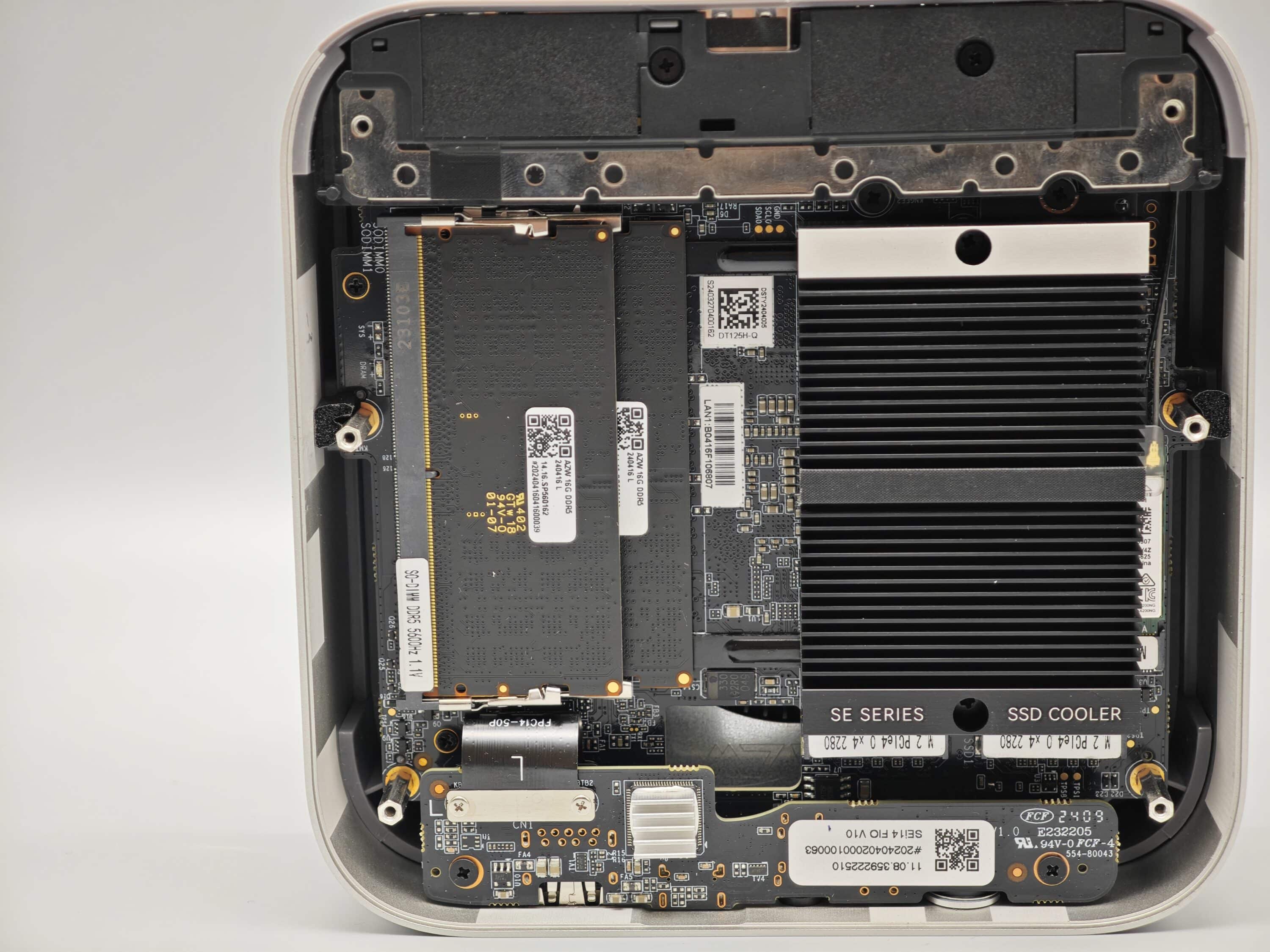 Haben wir diese dann entfernt, geht es über vier Kreuzschlitz-Schrauben in das Innenleben. Unter der Abdeckung platziert Beelink einen zusätzlichen Staubschutz, der noch einmal durch vier Kreuzschlitz-Schrauben gesichert ist. Sind auch diese entfernt, zeigt sich das aufgeräumte Innere des Mini-PCs mit zwei SO-DIMMs für den Arbeitsspeicher und zwei M.2 2280-Steckplätzen für SSDs.