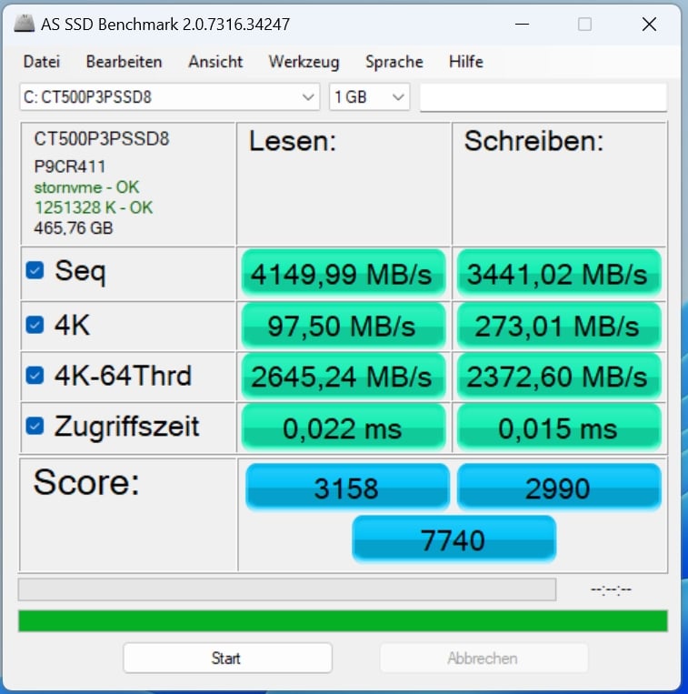 Doch beginnen wir zunächst mit der SSD, die eine wirklich gute Leistung an den Tag legt und diese erfreulicherweise auch unter dauerhafter Belastung aufrecht erhalten kann. Mit 4.149,99 MB/s lesend und 3.441,02 MB/s schreibend ruft die Crucial P3 Plus zwar nicht ihre maximale Leistung ab, positioniert sich aber deutlich vor den Speicherlösungen anderer Mini-PCs, sodass du hier auch auf lange Sicht gut aufgestellt sein dürftest.