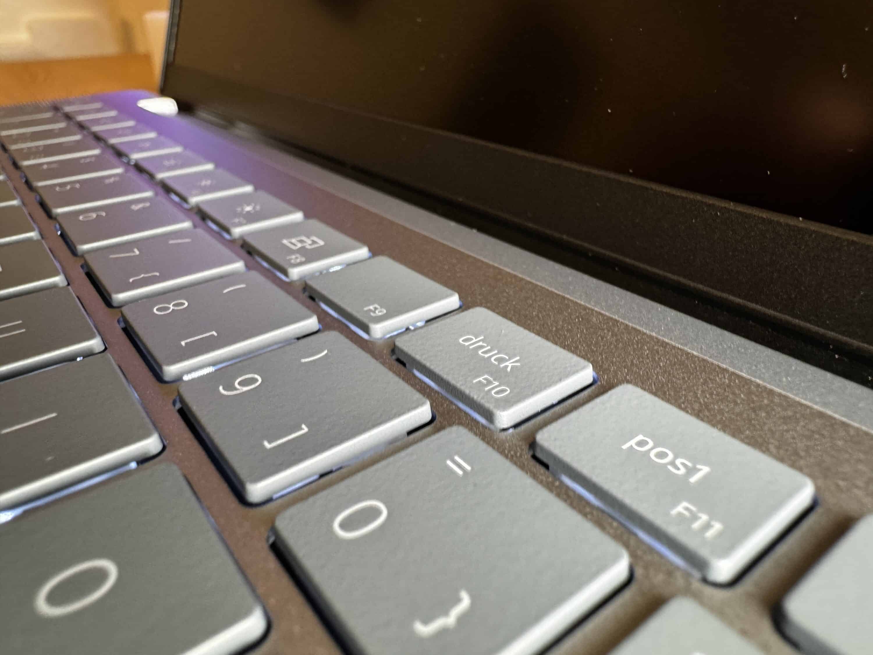 Das Dell Inspiron 14 Plus verfügt über eine gelungene Tastatur im kompakten Format ohne Num-Pad, die beim Schreiben eine gute Figur abgibt, wenngleich der Tastenhub gerne etwas höher hätte ausfallen dürfen.