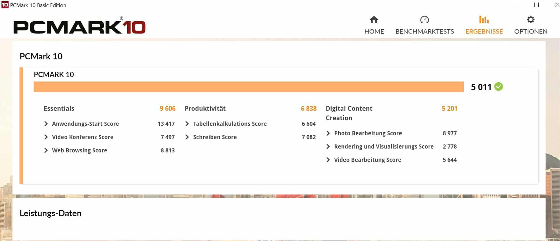 Beim PCMark10 Test erreicht das Notebook eine Gesamtpunktzahl von 5011 Punkten. Der PCMark10 bildet in seinem Testverfahren übliche Officetasks ab.