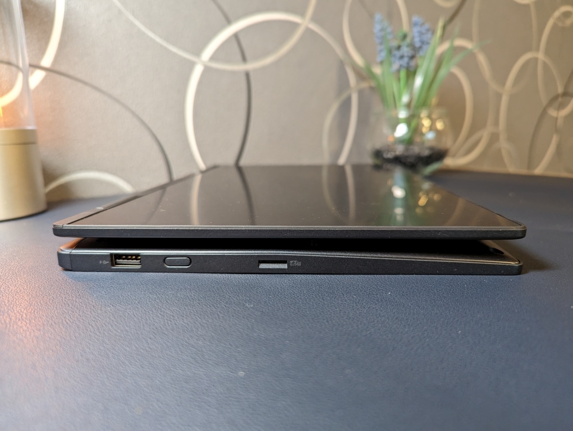 Zumal der Hersteller mit einer besonders hohen Robustheit dank Militärstandard MIL-STD-810H-Zertifizierung verspricht. Im Tablet-Modus, also wenn du das Display nach hinten umklappst, liegt das Gerät wackelfrei auf dem Tisch oder anderen Oberflächen auf.