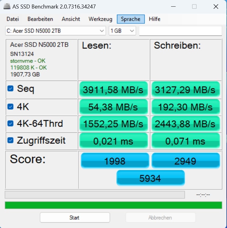 3.911,58 MB/s lesend und 3.127,29 MB/s schreibend können sich wirklich sehen lassen, während vor allem die 4K-64-Thrd-Werte von der neueren CPU profitieren. Am Ende gibt es mit 5.934 Gesamt-Punkten ein wirklich gutes Ergebnis.