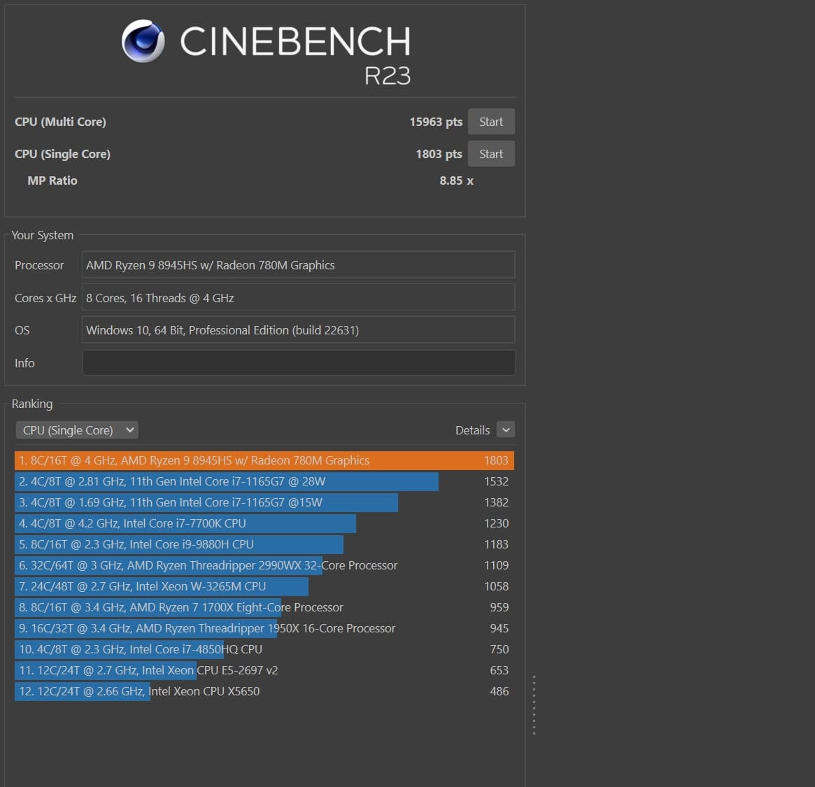 | Cinebench R23 Single Core | 1.803 Pkt. |