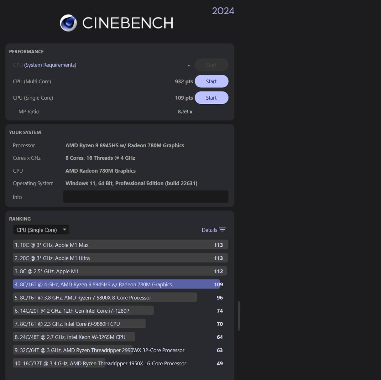 | Cinebench 2024 Single Core | 109 Pkt. |