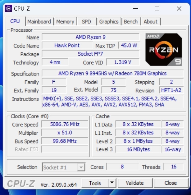 | Prozessor | AMD Ryzen 9 8945HS (8 Kerne, 16 Threads, 4.0 – 5.2 GHz) |