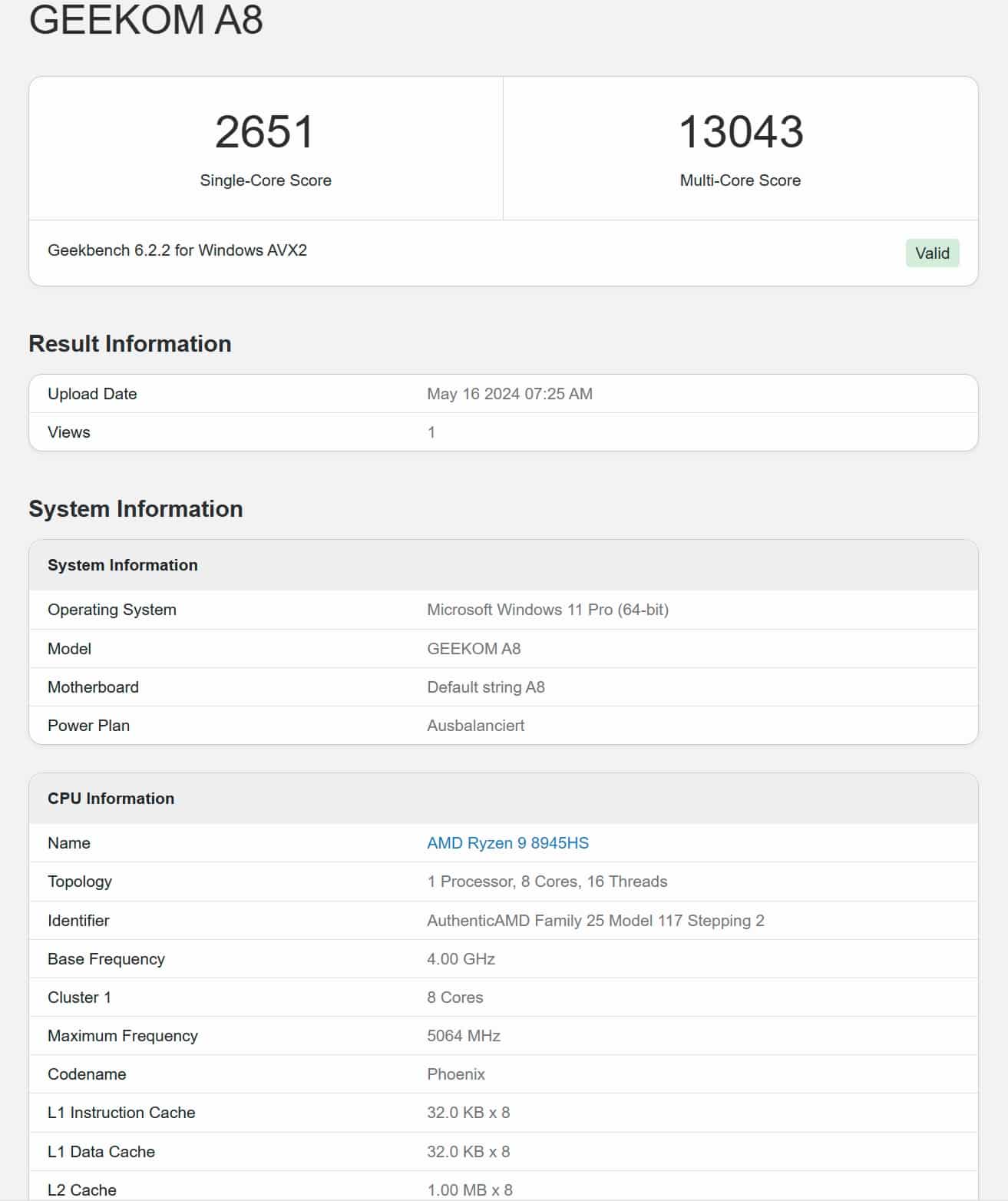Ansonsten ist die CPU mit 8 Kernen, 16 Threads und Taktraten zwischen 4,0 GHz und 5,2 GHz absolut identisch. 8 MB L2-Cache und 16 MB L3-Cache werden geboten, die maximal mögliche TDP von 54 Watt reizt Geekom nicht aus und lässt den A8 bei 45 Watt.