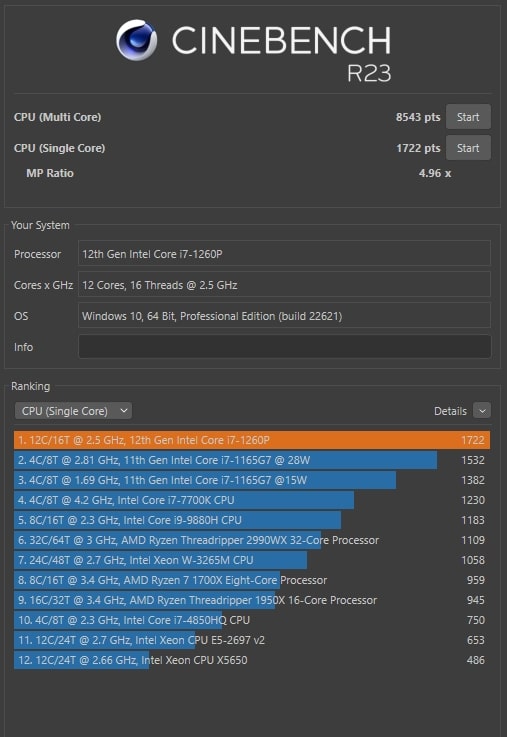 | Cinebench R23 Single Core | 1.722 Pkt. |