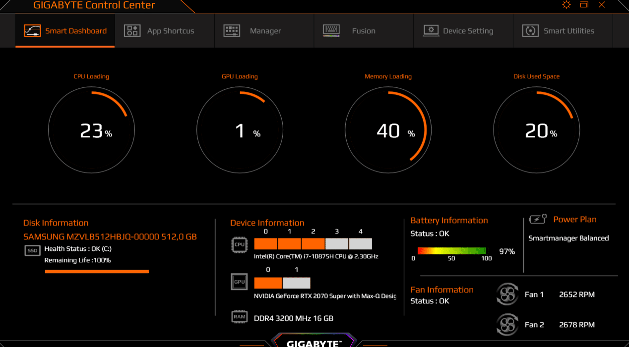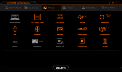 Die Software zum Aero 17 ist übersichtlich gehalten. Im Smart Dashboard sehen wir die Leistung unserer Komponenten, sowie den Akkustand. Die App Shortcuts sorgen für eine Übersicht eurer meist verwendeten Programme. Der Bereich Manager ist im Grunde auch ein kleines Dashboard, in dem ihr verschiedene Funktionen wie das WLAN, Bluetooth, usw. aus- und wieder einschalten könnt.