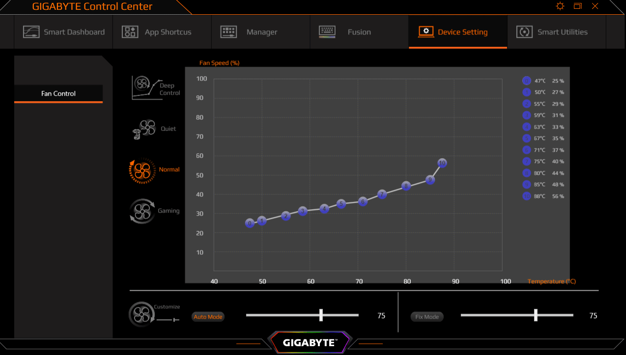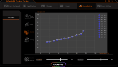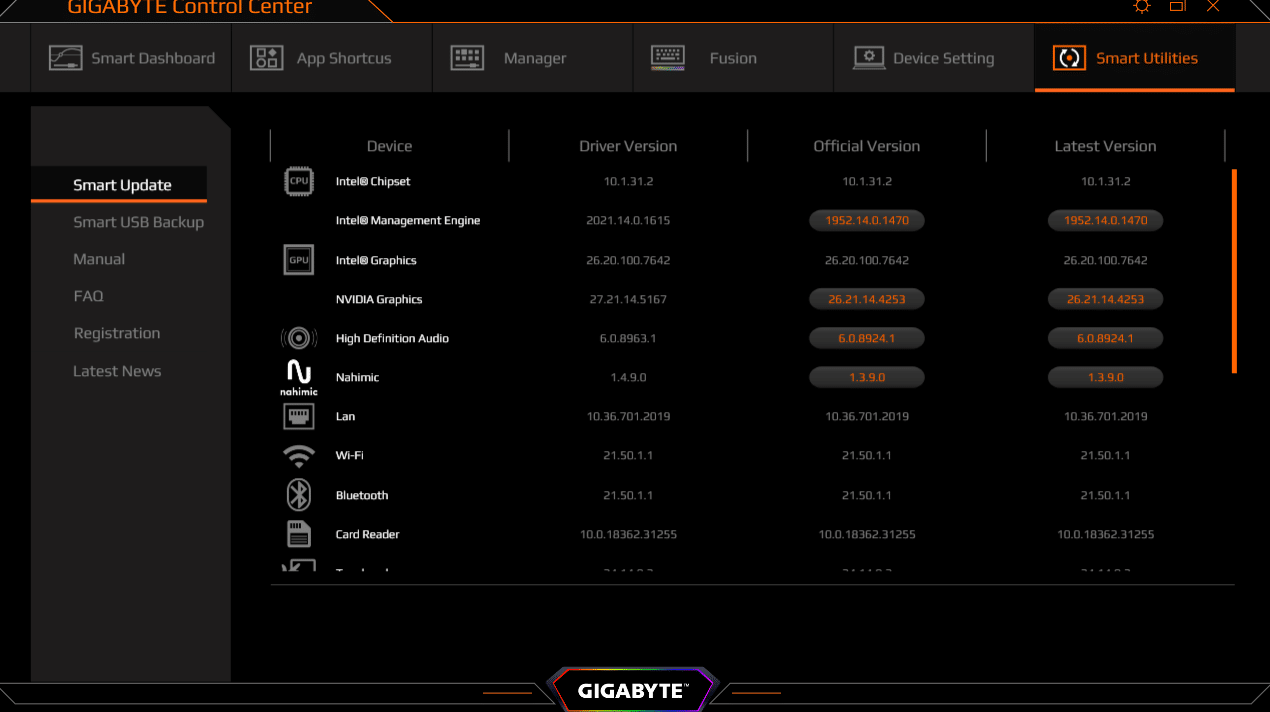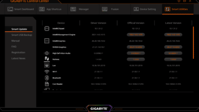 In Fusion dürft ihr die Beleuchtung der Tastatur frei nach euren Wünschen anpassen sowie Makros angelegen und bearbeiten. Falls ihr eure Lüfter auch individuell einstellen möchtet, wählt ihr den Punkt Device Settings. Zu guter Letzt Smart Utilities, wo Gigabyte euch verschiedene Tools zur Wartung eures Aero 17 anbietet. Dort habt ihr beispielsweise den Update-Stand eurer Software im Blick und könnt auch direkt Updates durchführen.