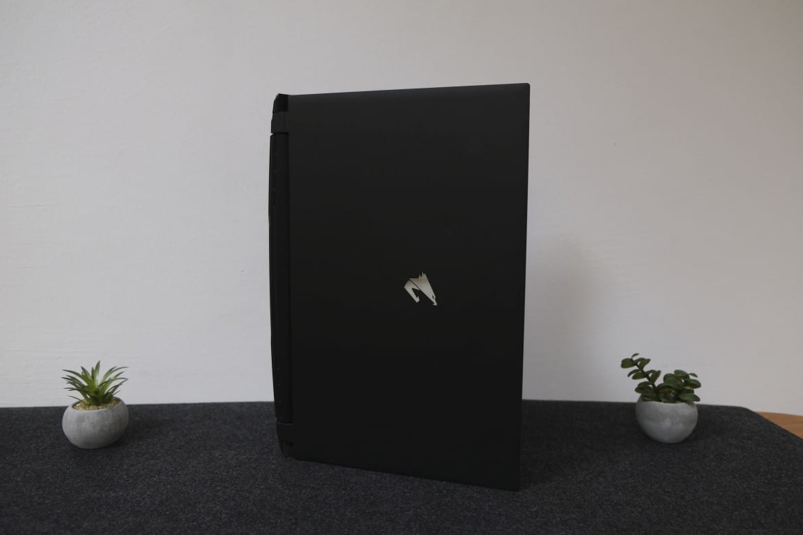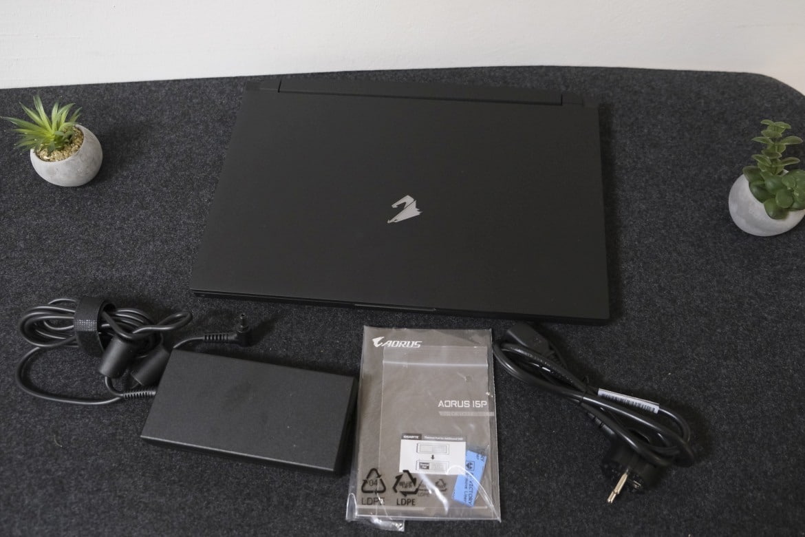 Mit Abmessungen von 357 x 244 x 27 mm (B x T x H) und einem Gewicht von rund 2,2 Kilogramm ohne Netzteil bringt das AORUS 15P YD etwas mehr auf die Waage, als beispielsweise das vergleichbar ausgestattete Razer Blade 15 Profi-Modell und fällt spürbar größer aus. Trotzdem ist es noch komfortabel im Rucksack zu verstauen. Der Grund für die zusätzliche Größe ist schnell ausgemacht: Gigabyte setzt bei seinem Gaming-Notebook aus besonders performanten Komponenten mit hohen TDP-Werten, doch dazu später mehr.