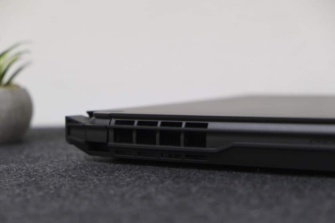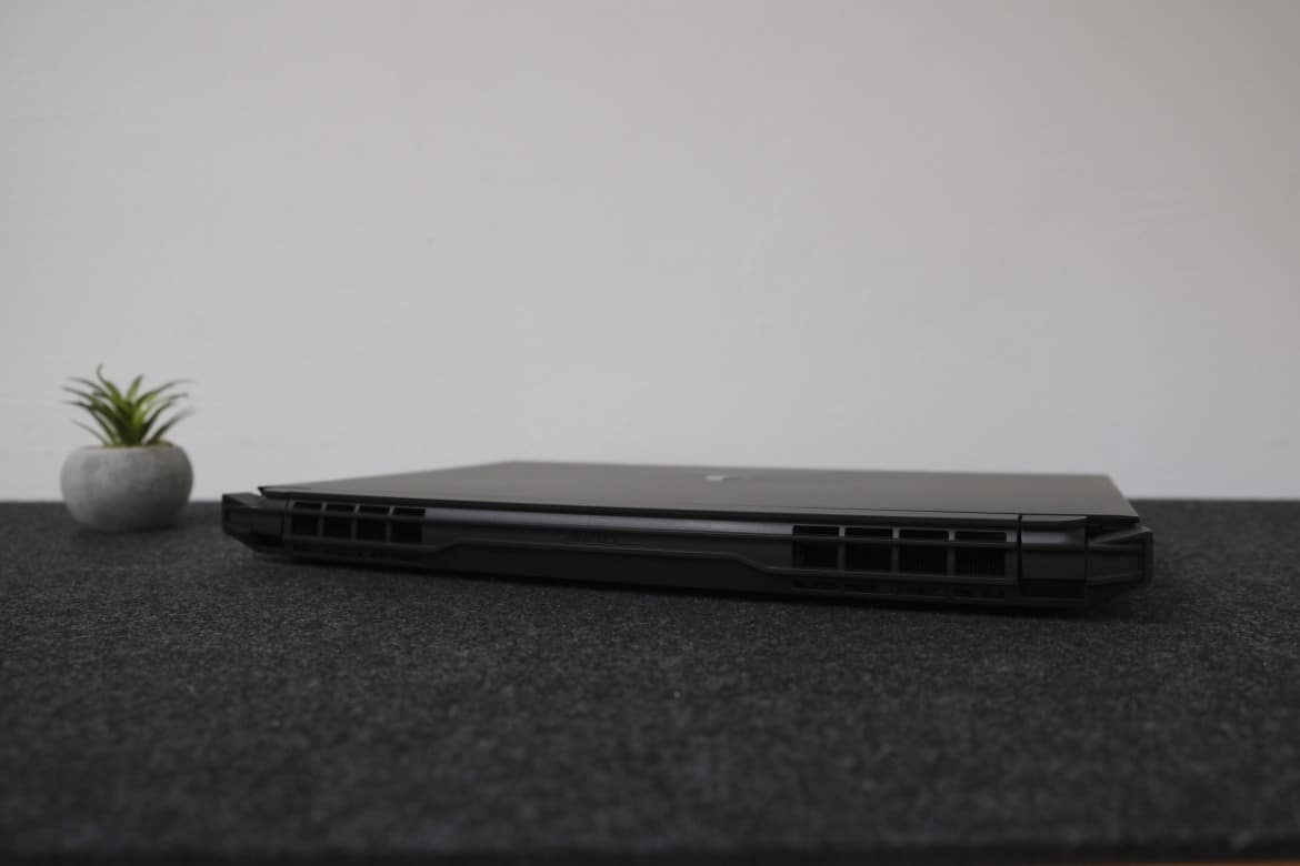Um die schiere Power zu bändigen und die Temperaturen im Zaum zu halten, verbaut Gigabyte beim AORUS 15P auch an den Seiten zusätzliche Luftauslässe, während rund zwei Drittel des Unterbodens ebenfalls für eine entsprechende Belüftung sorgen. Ansonsten hinterlässt das aus CNC-gefrästem Aluminium gefertigte Case hinsichtlich der Verarbeitung einen sehr guten Eindruck. Selbst unter Druck gibt das Gehäuse nicht nach, scharfe Kanten oder unsauber verarbeitete Bauteile sucht man erfreulicherweise vergebens.