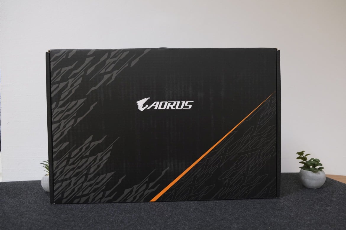 Bereits der schwarze, mit orangefarbenen und grauen Farbakzenten versehene Karton des Gigabyte AORUS 15P macht unmissverständlich klar, dass im Inneren ein echtes und gleichzeitig kompaktes Kraftpaket schlummert.