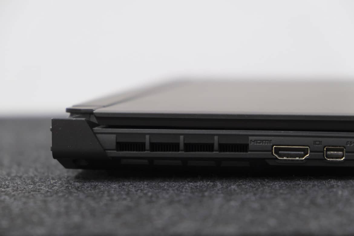 Die zusätzliche Gehäuse-Größe nutzt GIGABYTE beim AORUS 15P YD hervorragend aus und bietet – im Vergleich zum Razer Blade 15 und vielen anderen Gaming-Notebooks – deutlich mehr Anschlüsse. Auf der linken Seite positioniert der Hersteller einen HDMI 2.1 Port, einen Mini Displayport 1.4, USB 3.2 Gen 1 (Typ A), einen Audiokombo-Anschluss und sogar einen vollwertigen Gigabit-Ethernet-Port, was gerade kompetitive Gamer begeistern dürfte.