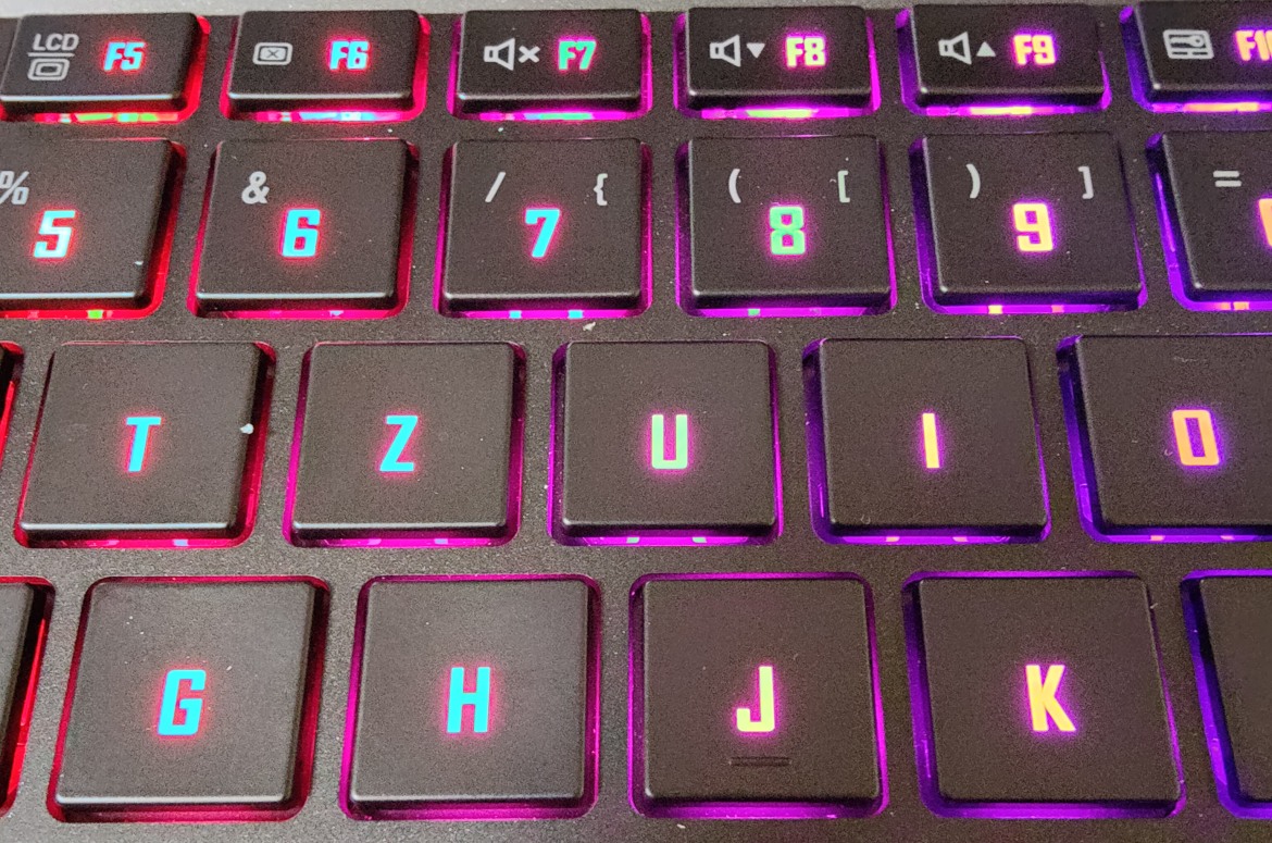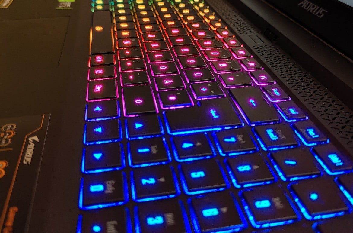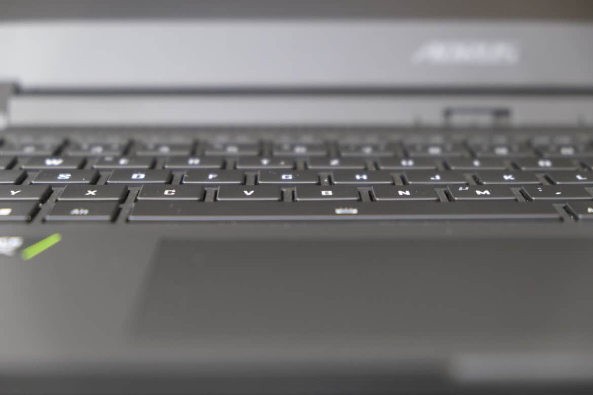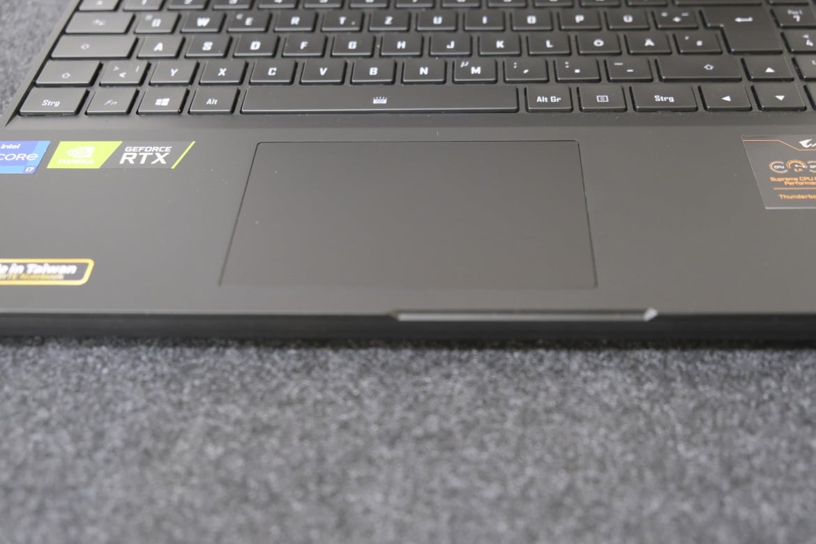 Bei der Tastatur setzt Gigabyte einmal mehr auf Chiclet-Tasten. Sie bilden einen sehr kurzen, dabei aber äußerst präzisen Hub und sorgen für ein hervorragendes Tippgefühl – sowohl beim Schreiben als auch im Gaming-Betrieb. Besonders die deutlich spürbaren Druckpunkte und der knackige Tastenwiderstand haben uns im Test sehr gut gefallen.