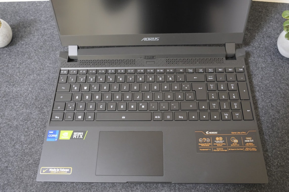Nicht überzeugen konnten mich allerdings die verbauten DTS-X-Lautsprecher. Sie erreichen zwar eine wirklich gute Lautstärke, können klanglich aber nicht mit den integrierten Lösungen anderer Notebooks mithalten. Sie sind zu schwammig abgestimmt, während der Bass zu stark in den Vordergrund tritt. Außerdem drehen die Lüfter unter Volllast so laut, dass ein Headset zum Spielen Pflicht ist. Genauso wie extern angeschlossene Maus und Tastatur, denn obwohl die verbauten Lösungen gute Arbeit liefern, mangelt es vor allem dem Trackpad etwas an Präzision.