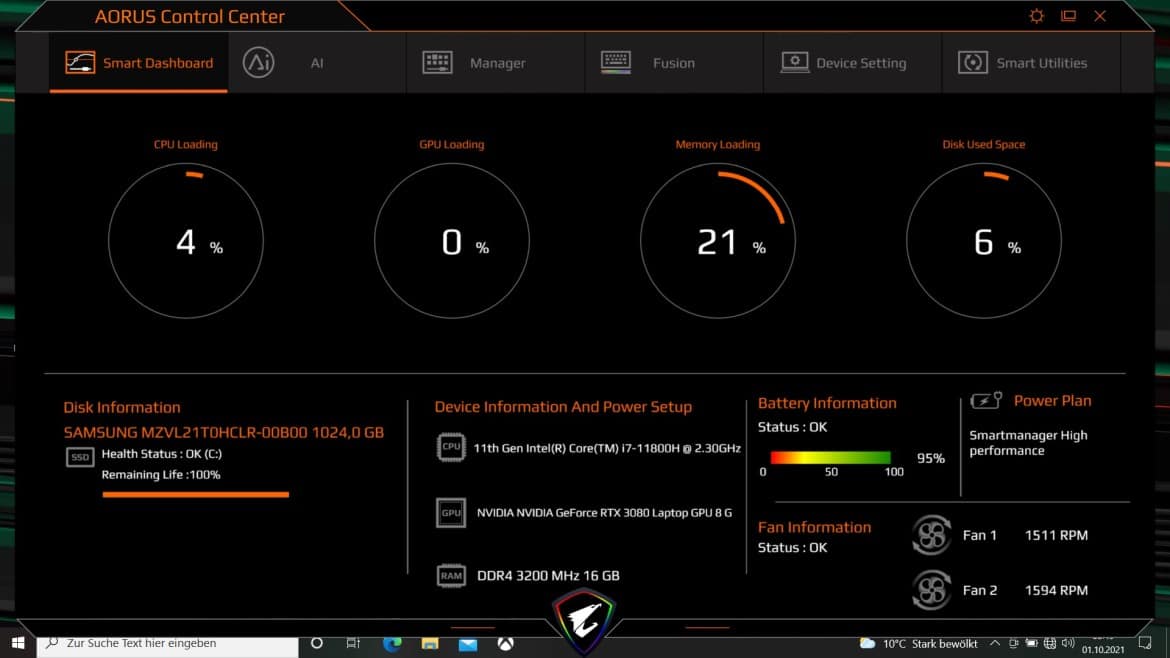 Der Prozessor bietet dementsprechend acht dedizierte Kerne samt 16 Threads. Die Taktraten liegen dabei zwischen 2,3 und 4,6 GHz im Turbo-Modus, der mit einem angeschlossenen Netzteil aktiviert wird. In Kombination mit der starken Nvidia GeForce RTX 3080, die mit einer TGP von 130 Watt konfiguriert ist, gibt das AORUS 15P YD selbst bei anspruchsvollsten Games Vollgas und setzt sich in Benchmark- und Spiele-Tests mitunter deutlich von der gesammelten Konkurrenz ab. Im Vergleich: Das Razer Blade 14 (unser Test) kommt auf 100W TDP.