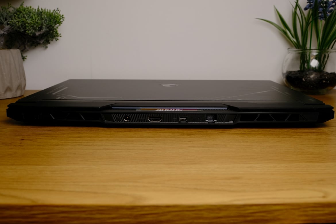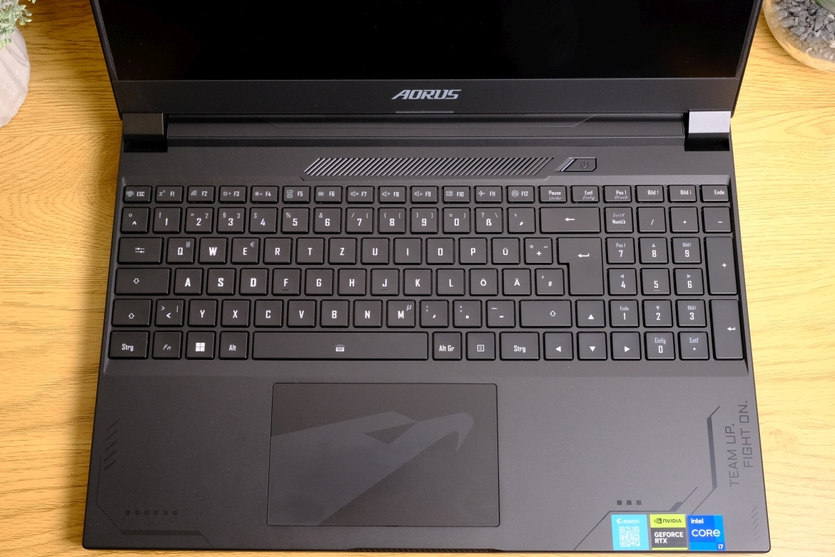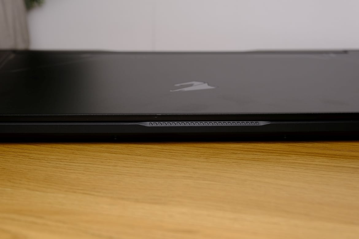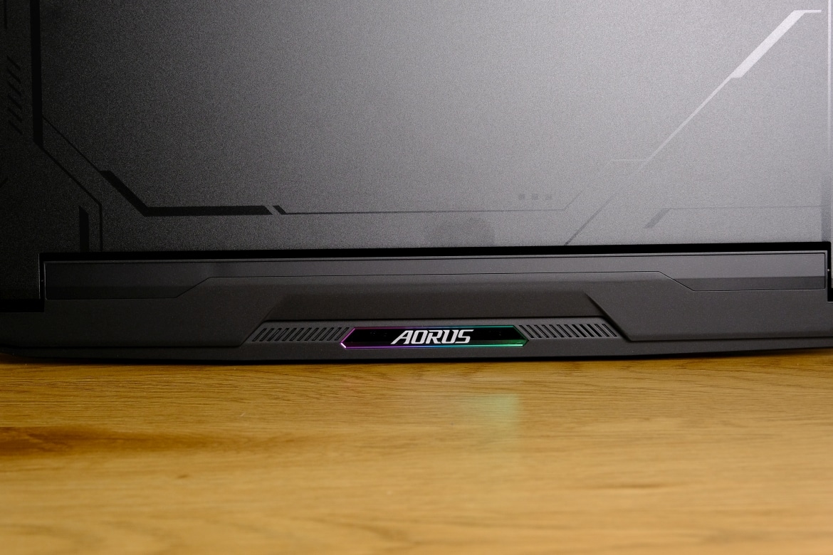 Am hinteren Bereich des Notebooks findet sich zudem der AORUS-Schriftzug, der das Licht je nach Einfall in bunten Farben reflektiert. Eine RGB-Beleuchtung wird in Form eines kleinen Streifens oberhalb des Schriftzuges realisiert – nicht zu auffällig also. Auch die Form der Luftein- und -auslässe unten, sowie an den Seiten, sorgen für eine moderne Optik des Gaming-Notebooks.