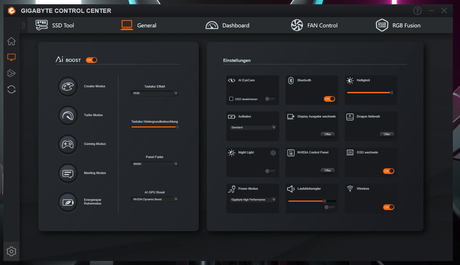 Deutlich praktischer sind aber die verschiedenen Leistungsmodi, in denen du etliche Parameter selbst bestimmen kannst. Von der Tastaturbeleuchtung über die GPU-Boost bis hin zur Lautstärke oder Display-Helligkeit. Hier stehen verschiedene Modi wie Creator, Turbo, Gaming oder Meeting zur Wahl.