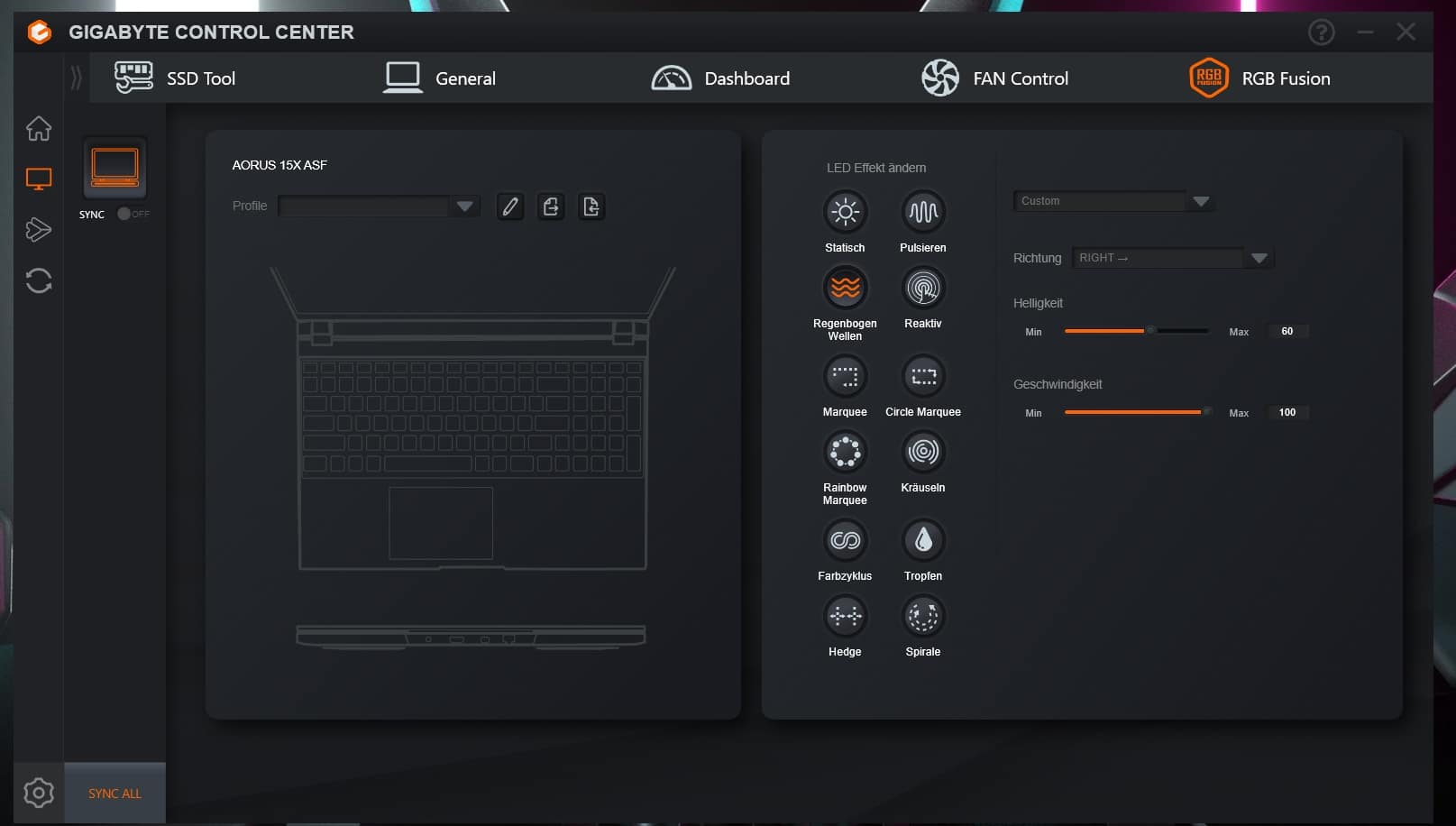 Sämtliche Tasten können individuell beleuchtet werden, de Helligkeit der RGB-Beleuchtung lässt sich in der Software Gigabyte Control Center frei zwischen 0 und 100 Prozent anpassen. Das Touchpad ist mit 7,6 cm x 12 cm angenehm groß und bietet einen angenehmen Druckpunkt, sowie hervorragende Gleiteigenschaften.