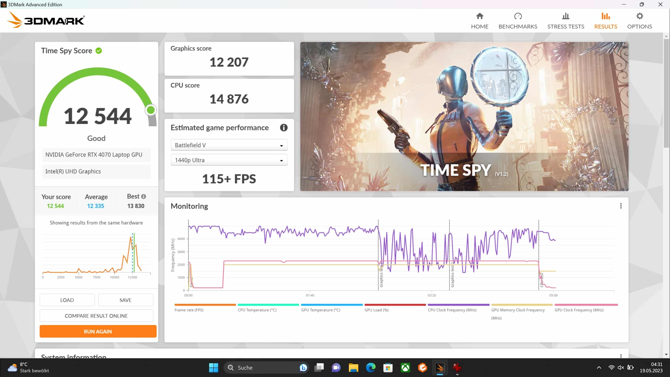7.207 Gesamtpunkte sind jedoch dennoch sehr gut, wenngleich das Lenovo Legion 5 Pro (unser Test) mit dem Vorjahresmodell i7-12700H hier knapp 300 Punkte in Führung liegt.