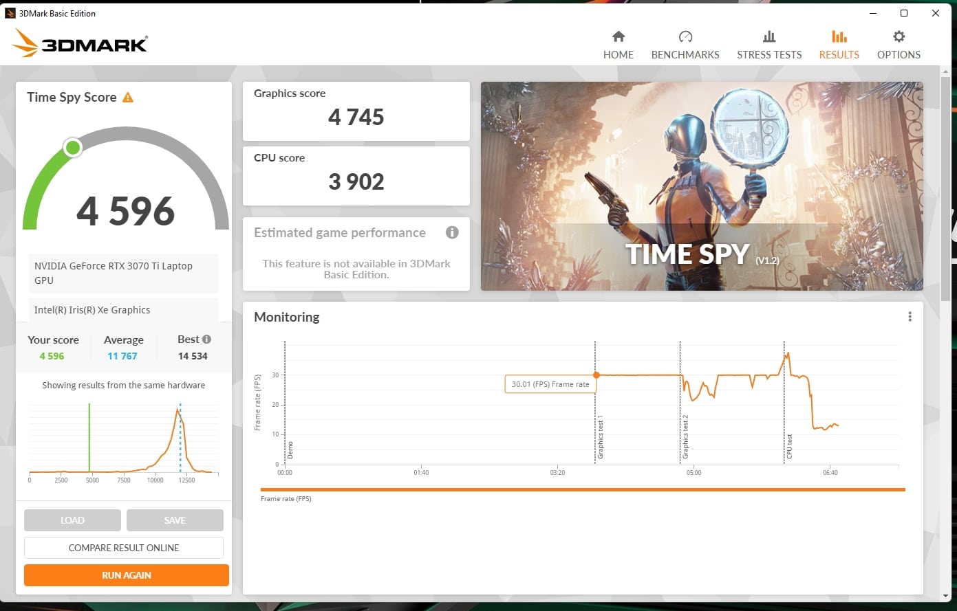 Wie bereits angesprochen kann das Notebook im Akkubetrieb aber nicht mithalten – und das deutlich. Hier habe ich lediglich den Time Spy-Benchmark laufen lassen. Das Ergebnis ist ernüchternd: 4.596 Gesamtpunkte, ein Grafik Score von 4.745 Punkten und ein CPU Score von 3.902 Punkten springen am Ende heraus – weniger als halb so viel und bei der CPU sogar nur ein Drittel des Wertes mit angeschlossenem Netzteil.