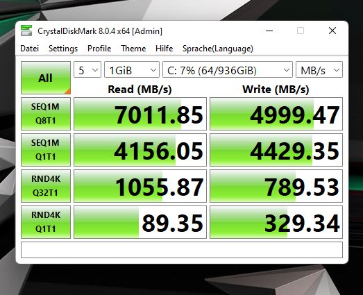 Die verbaute PCIe 4.0-SSD aus dem Hause Gigabyte leistet im Benchmark-Test ganze Arbeit und überzeugt mit einem hervorragenden Tempo am Ende stehen im CrystalDiskMark rund 7.012 MB/s beim sequenziellen Lesen und 5.000 MB/s beim sequenziellen Schreiben zu Buche.