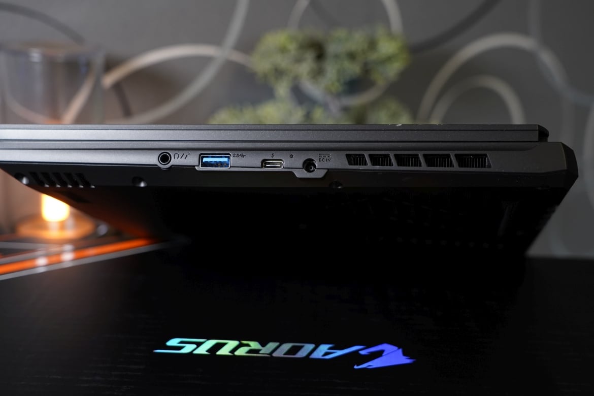 Rechts findest du einen kombinierten 3,5-mm-Klinkenanschluss, ein Mal USB 3.2 Gen 1 (USB A), ein Mal USB-C mit Thunderbolt 4 (inklusive DisplayPort-Funktion) und den Netzanschluss für die Verbindung mit dem Netzteil. Das Einzige was wir vermissen würden, ist ein Speicherkartenleser, in welcher Form auch immer. Den hatte das AORUS 15P YD aus dem Vorjahr noch zu bieten. Auch USB PowerDelivery wäre noch nice-to-have.