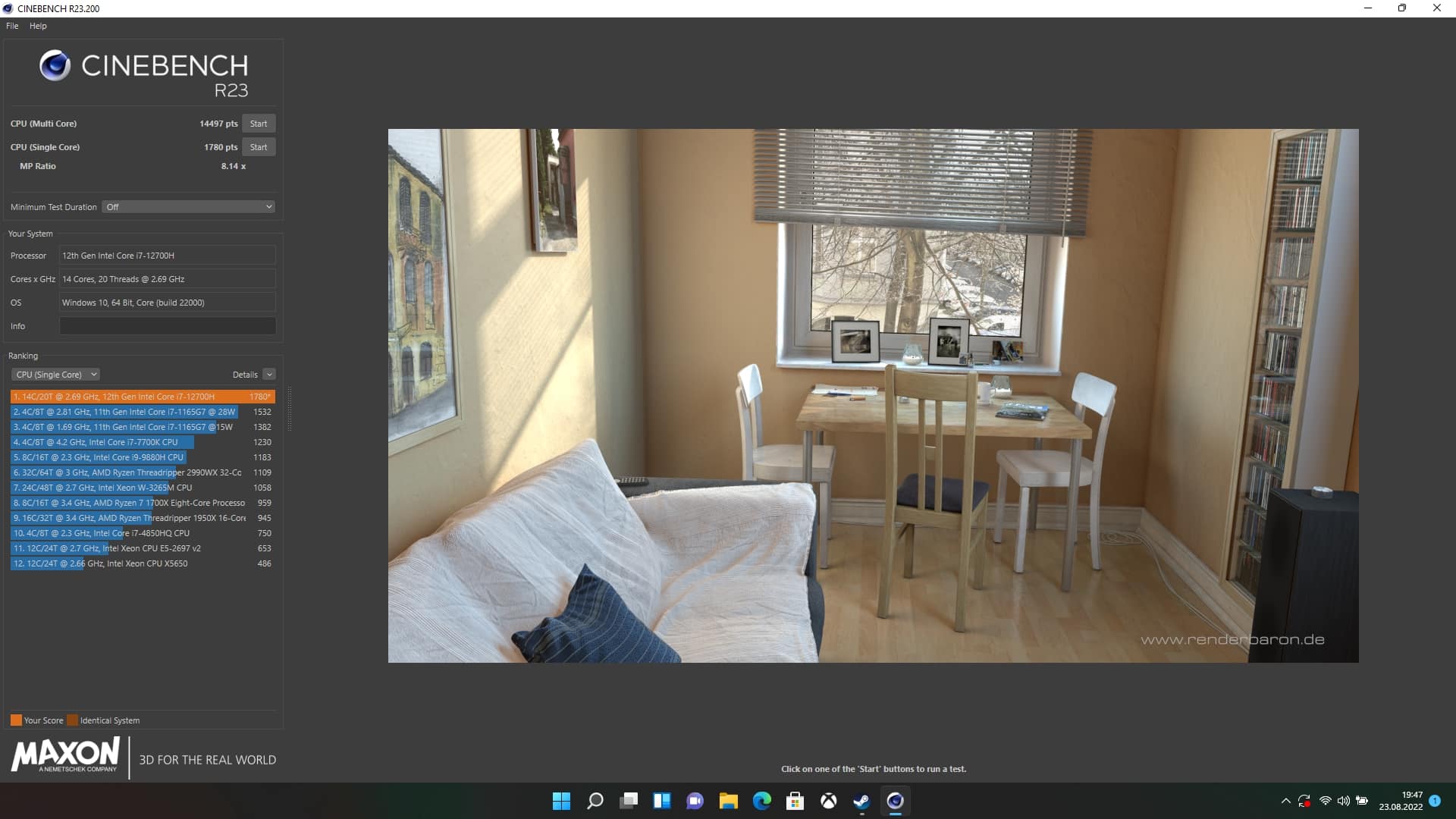 In Cinebench R23 erreicht das Gigabyte Aorus 17 XE4 in unserem Test einen sehr guten Multi-Core-Wert von 14.497 Punkten und im Single Core 1.780 Punkte. Damit liegt man auf dem Niveau, was von der verbauten Intel Core i7-12700H CPU auch erwartet werden kann. Das resultiert in einer MP Ration von 8,14.