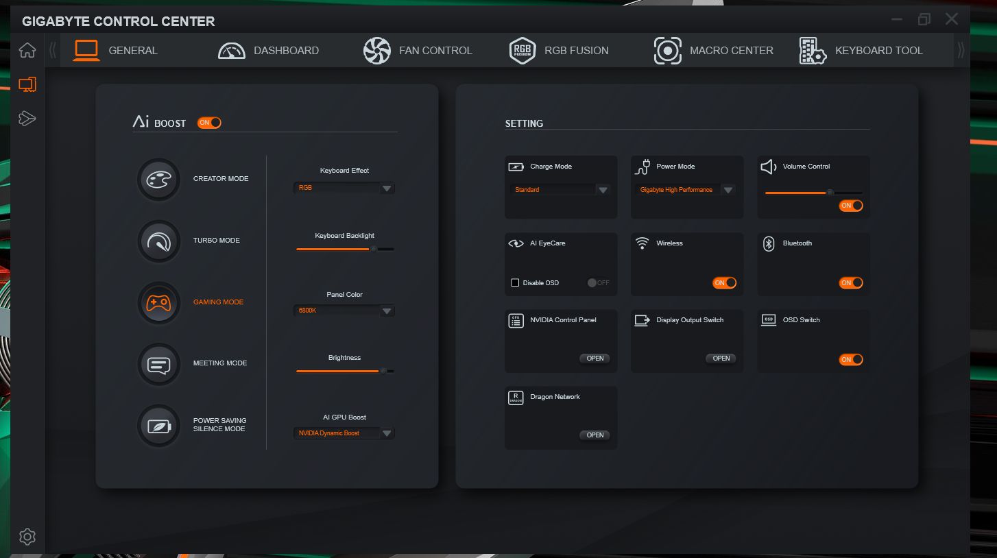 Die Leistung kannst du zudem mithilfe des Gigabyte Control Center beeinflussen oder der KI die Auswahl des Betriebsmodus überlassen. Hier stehen dir verschiedene Optionen zur Wahl. Von einem besonders leisen „Power Saving Silcende Mode“ bis hin zum „Turbo Mode“, bei dem die Lüfter dauerhaft auf Hochtouren laufen, um die maximal mögliche Leistung abzurufen.