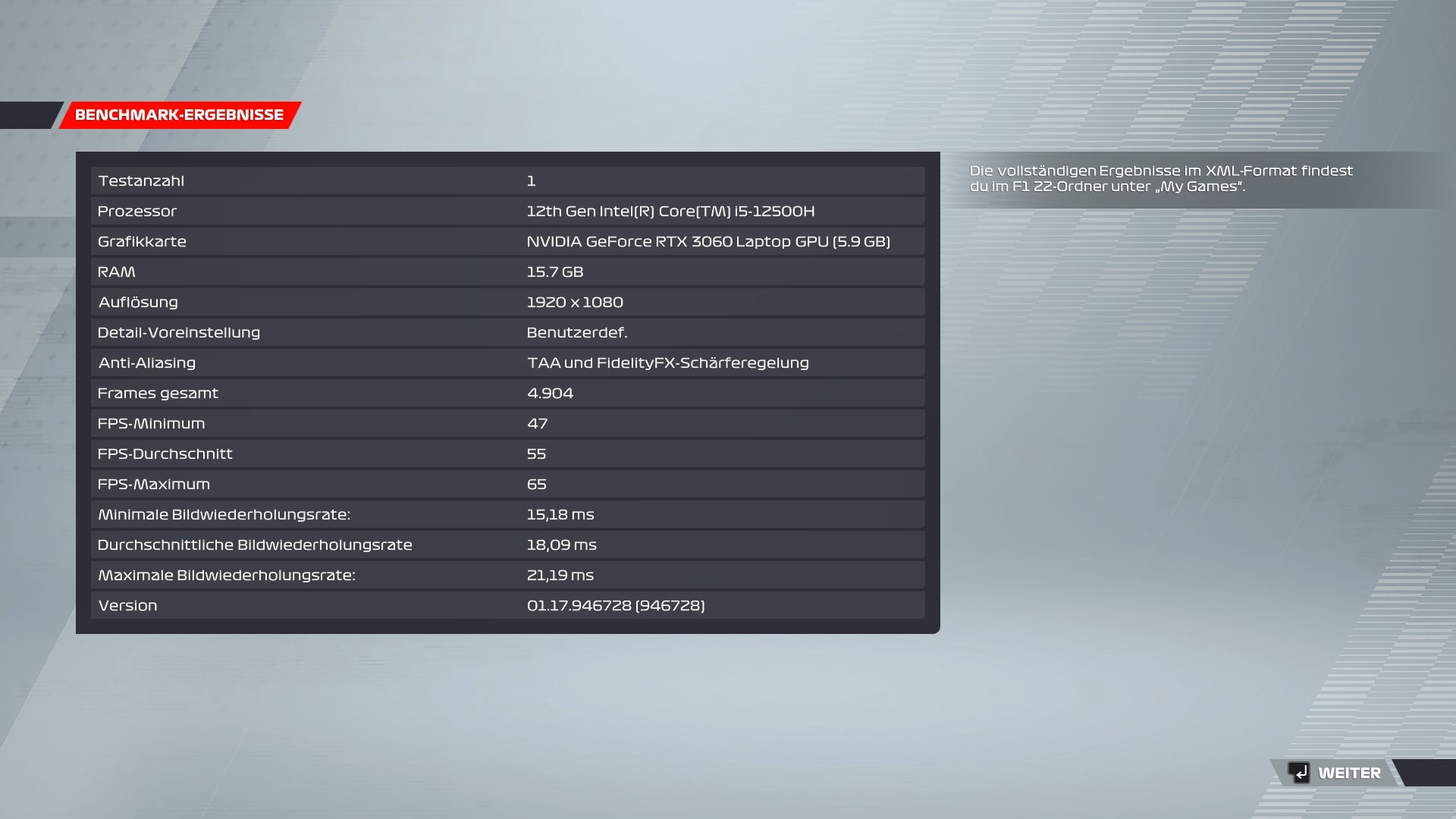 | F1 22 (Max Setting; RT Max.) | 55 fps (Durchschnitt) |