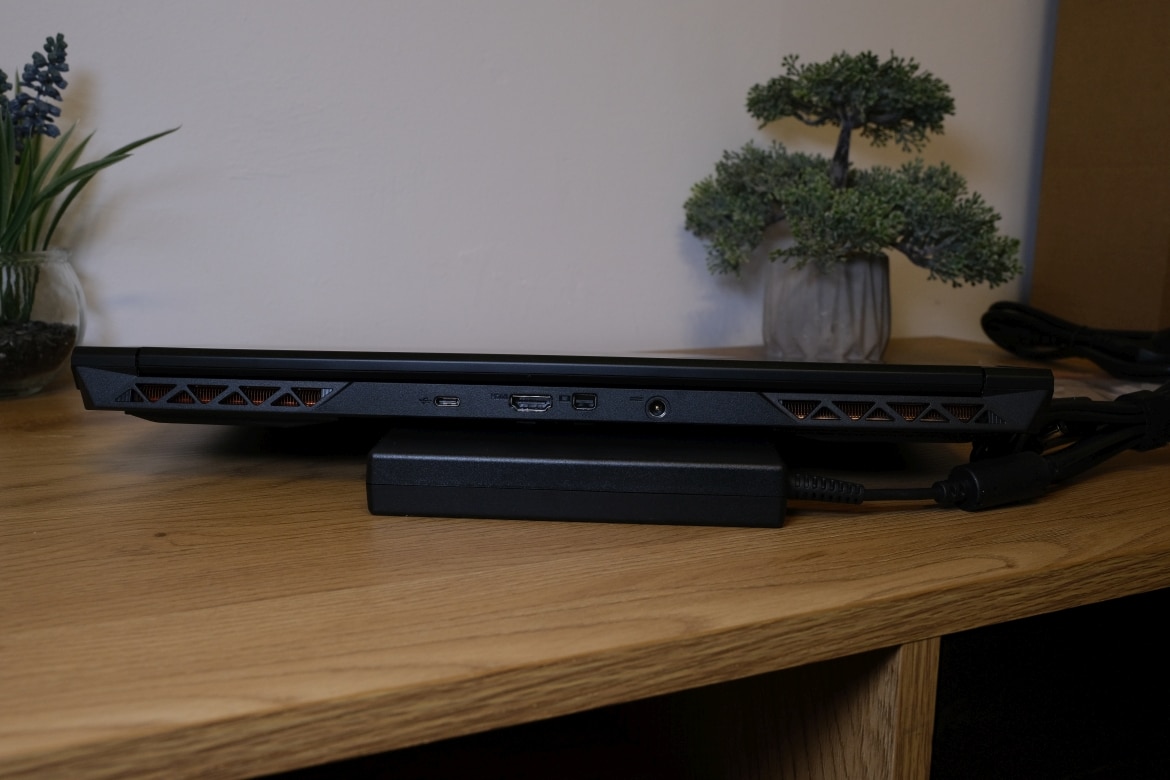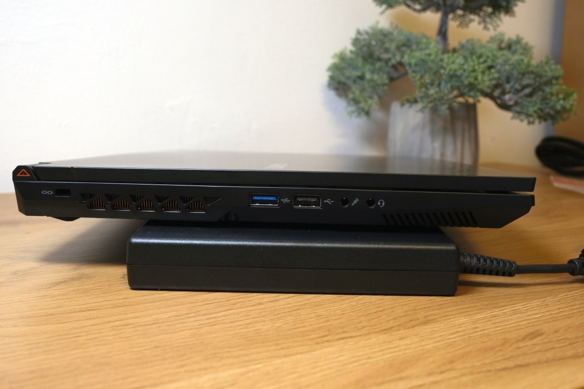 Hier schließt du beispielsweise das beiliegende Netzteil an, was ich sehr angenehm finde – im Vergleich zu den meisten Lösungen anderer Hersteller an der Seite. Außerdem findest du hier einen HDMI 2.1-Anschluss , 1x Mini-DisplayPort 1.4 und einmal USB 3.2 Gen 2 Typ C. Bedeutet: Nutzt du das Notebook auf einem Ständer oder in einer Halterung, erfolgt die Verbindung zum Display und der Stromversorgung (die zum Gaming ja ohnehin immer gegeben sein sollte, wie bei allen Gaming-Laptops) vollständig über die Rückseite, die beiden Seiten bleiben frei.