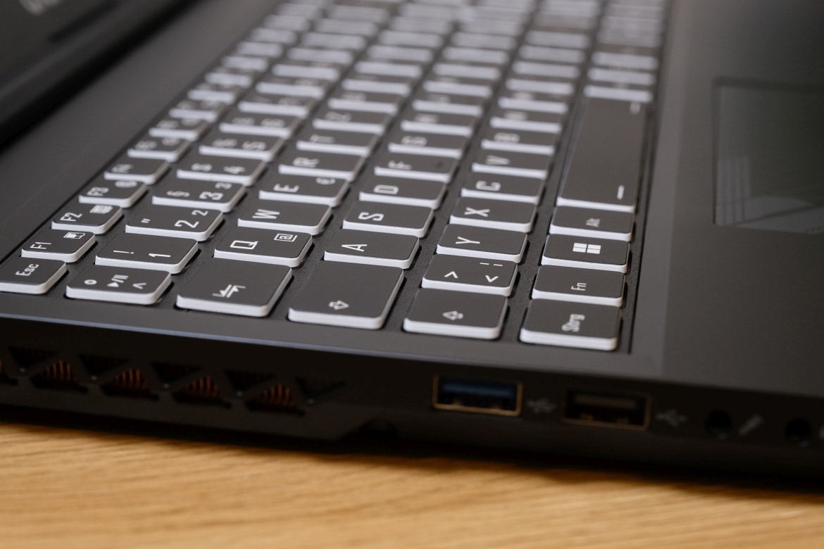 Interessant für ein 15,6-Zoll-Notebook: Im Gigabyte G5 KE findet sich eine Tastatur in voller Größe, also mit dediziertem Nummern-Block. Die schwarzen Chiclet-Tasten warten mit einer weißen Beschriftung und weißen Seiten auf, was für einen angenehmen Kontrast sorgt.