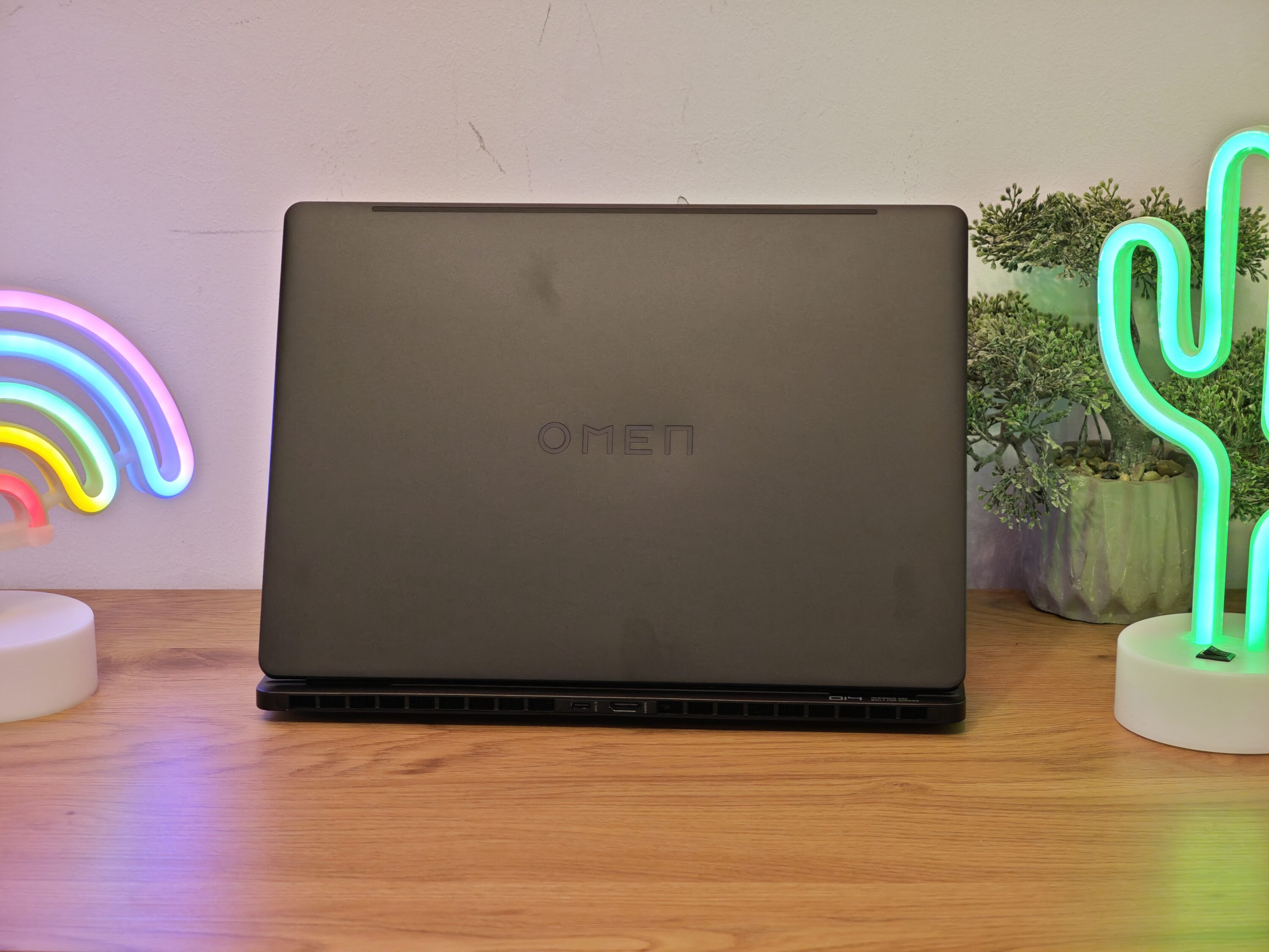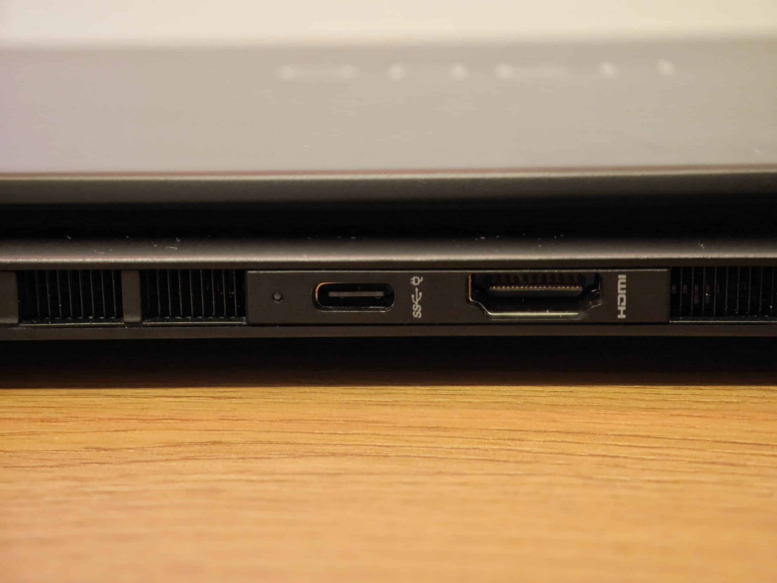 Auch die Auswahl an Anschlüssen des Omen gefällt, dabei verteilen sich die Ports auf drei Seiten: Hinten findet ihr je einmal HDMI 2.1 und einen USB-C-Port mit 10 GBps, DisplayPort 1.4 und Power Delivery. Links gibt es einen weiteren USB-C-Port mit Thunderbolt 4 für volle 40 Gbps, ebenfalls samt PowerDelivery und DP-Alt-Modus, sowie einen 3,5-mm-Klinkenanschluss.