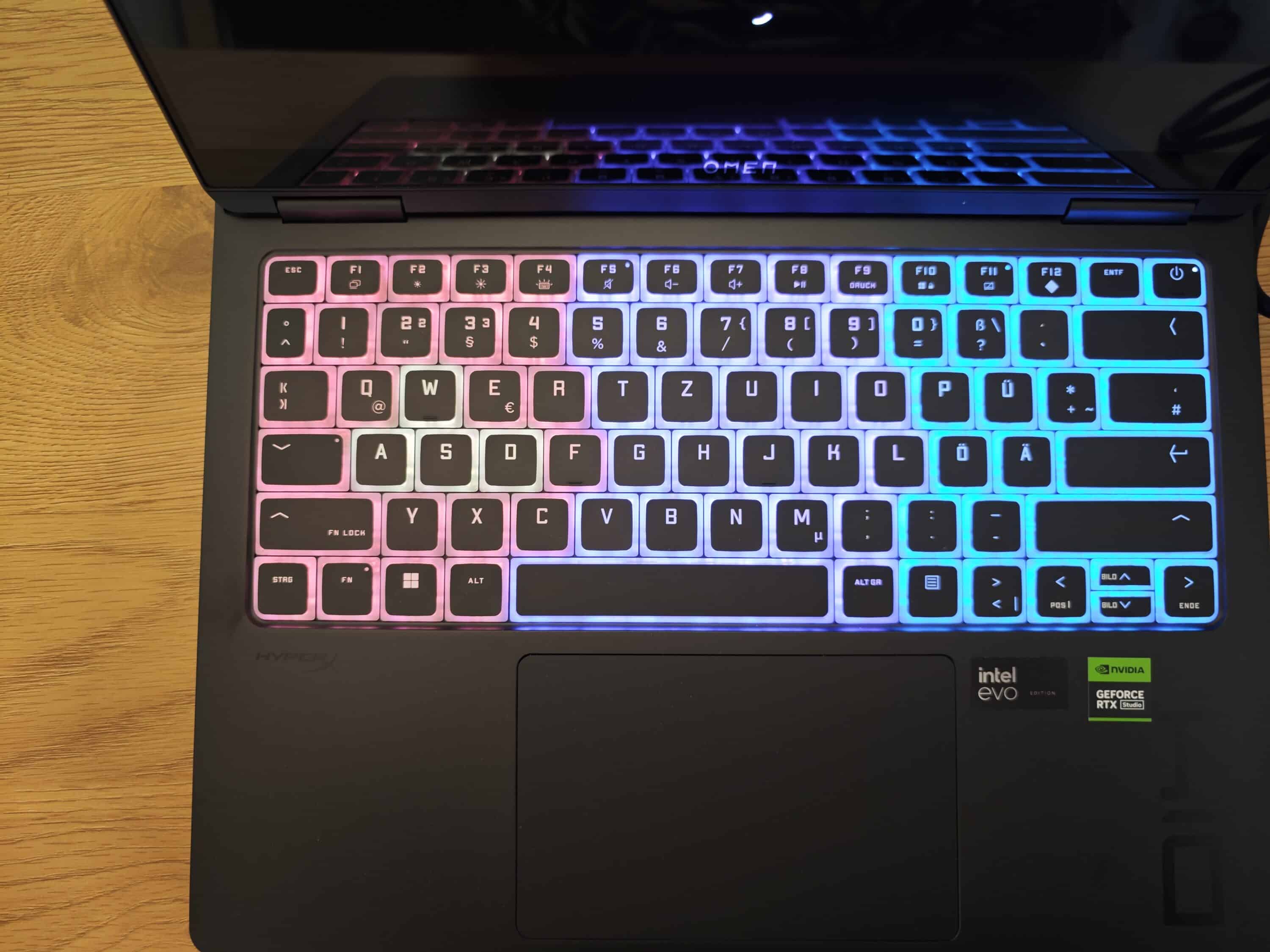 Die Tastatur ist dann auch das Einzige, das das Omen Transcend 14 als Gaming-Notebook identifiziert, denn der Hersteller präsentiert dem Laptop eine RGB-Einzeltastenbeleuchtung, die sich individuell anpassen lässt.
