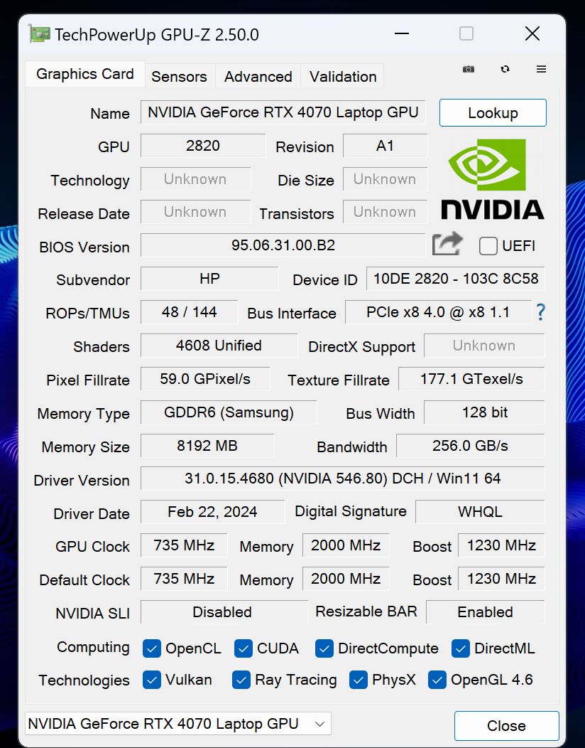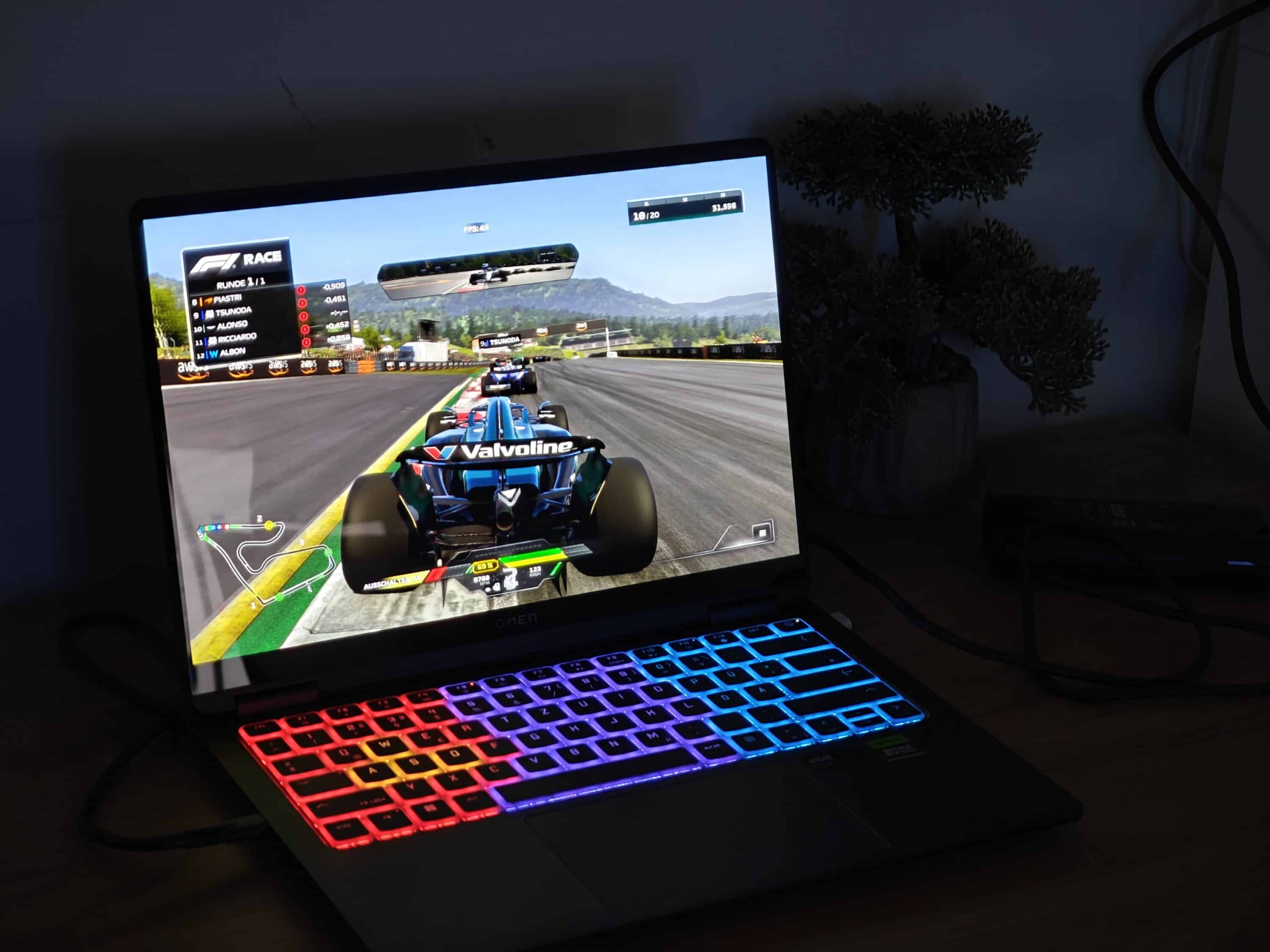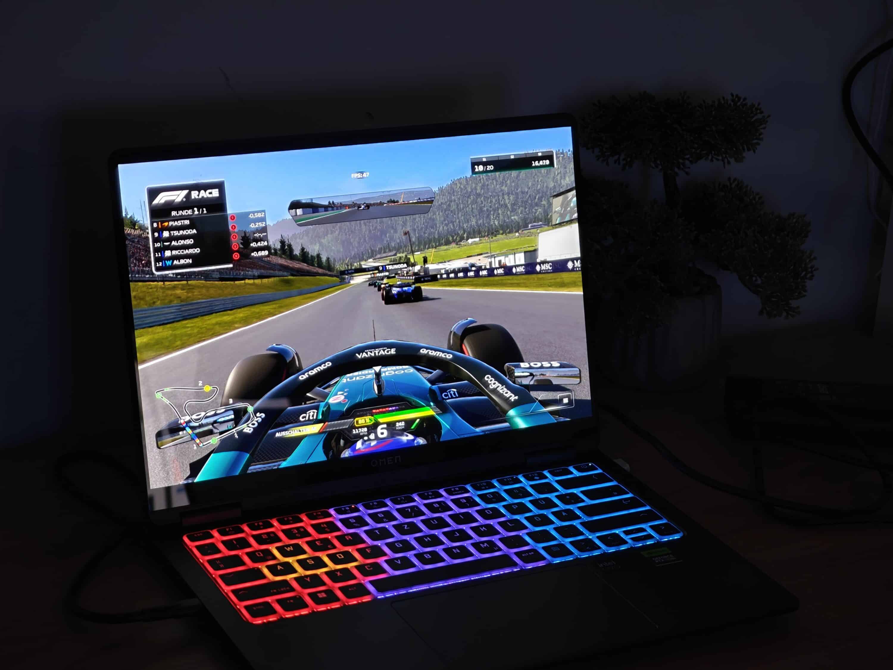 So viel zur Theorie. In der Praxis liefert das Notebook aber genügend Leistung, um auch moderne Spiele in mittleren oder hohen Details absolut flüssig darzustellen. Bei wirklichen Grafik-Bretter wie Cyberpunk 2077 oder F1 24 mit maximalen Raytracing-Einstellungen solltet ihr den Detailgrad oder die Auflösung jedoch etwas herunterschrauben, um flüssige 60 fps erreichen zu können und – wenn möglich – DLSS aktivieren.