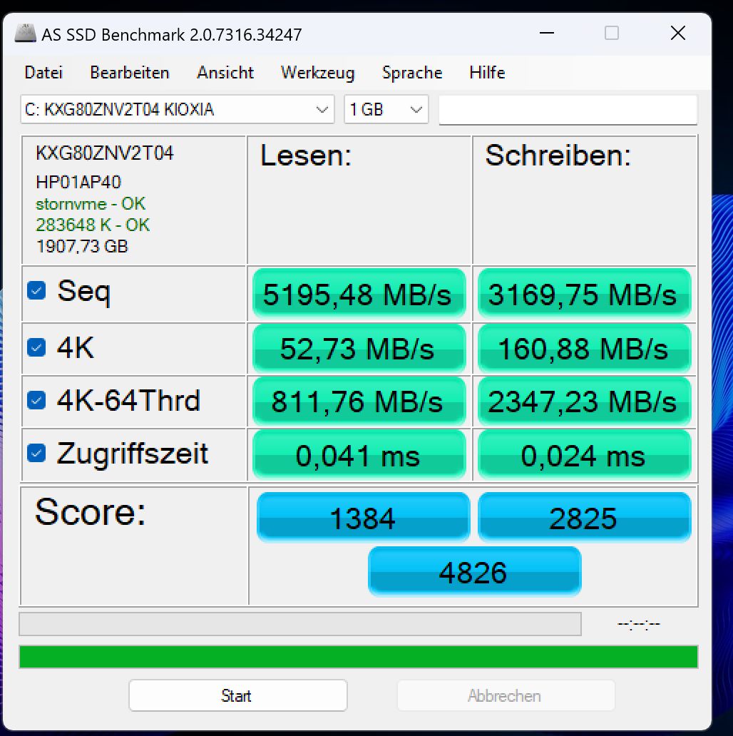 Die verbaute SSD stammt von Kioxia und von den 2 Terabyte Speicherplatz stehen rund 1.900 GB zur freien Verfügung. Mit einer sequenziellen Lesegeschwindigkeit von rund 5.200 MB/s und einer Schreibgeschwindigkeit von 3.170 MB/s liefert der Speicher gute Ergebnisse, die selbst für anspruchsvollste moderne Games absolut ausreichend sind.