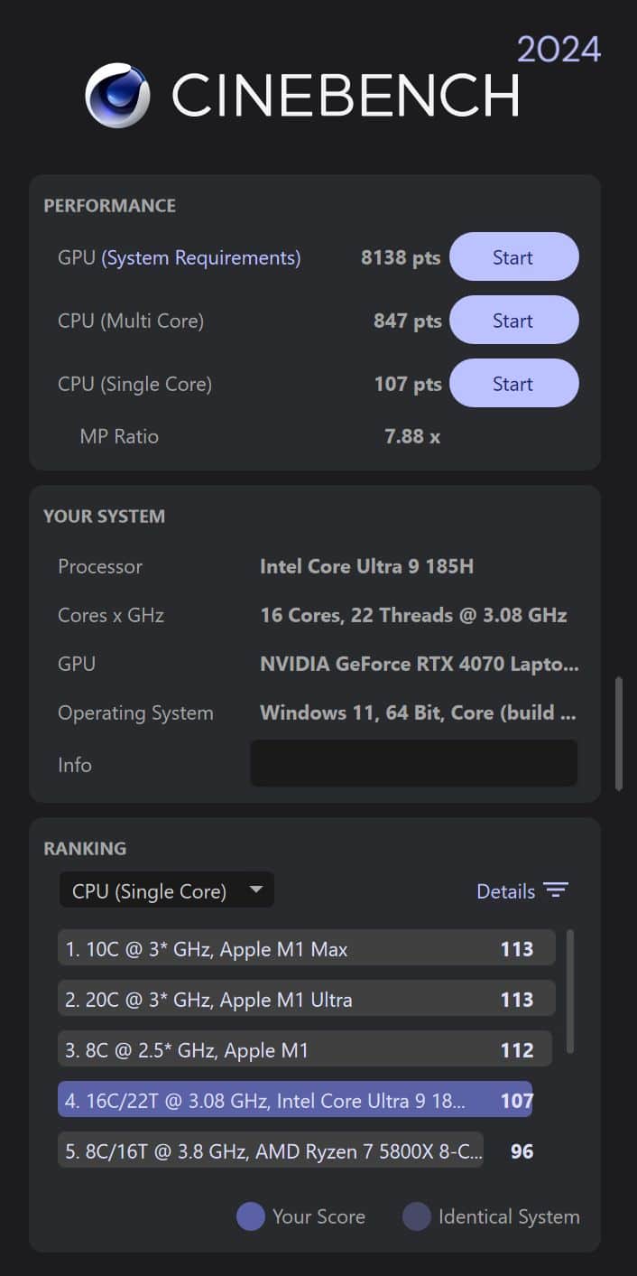 In Cinebench 2024 beispielsweise reicht das Notebook mit 847 Punkten im Multi-Core-Test nicht ganz an den Intel Core Ultra 7 155H im Alienware m16 R2 (unser Test) heran, hat allerdings im Single-Core-Betrieb in beiden Cinebench-Versionen die Nase vorn.