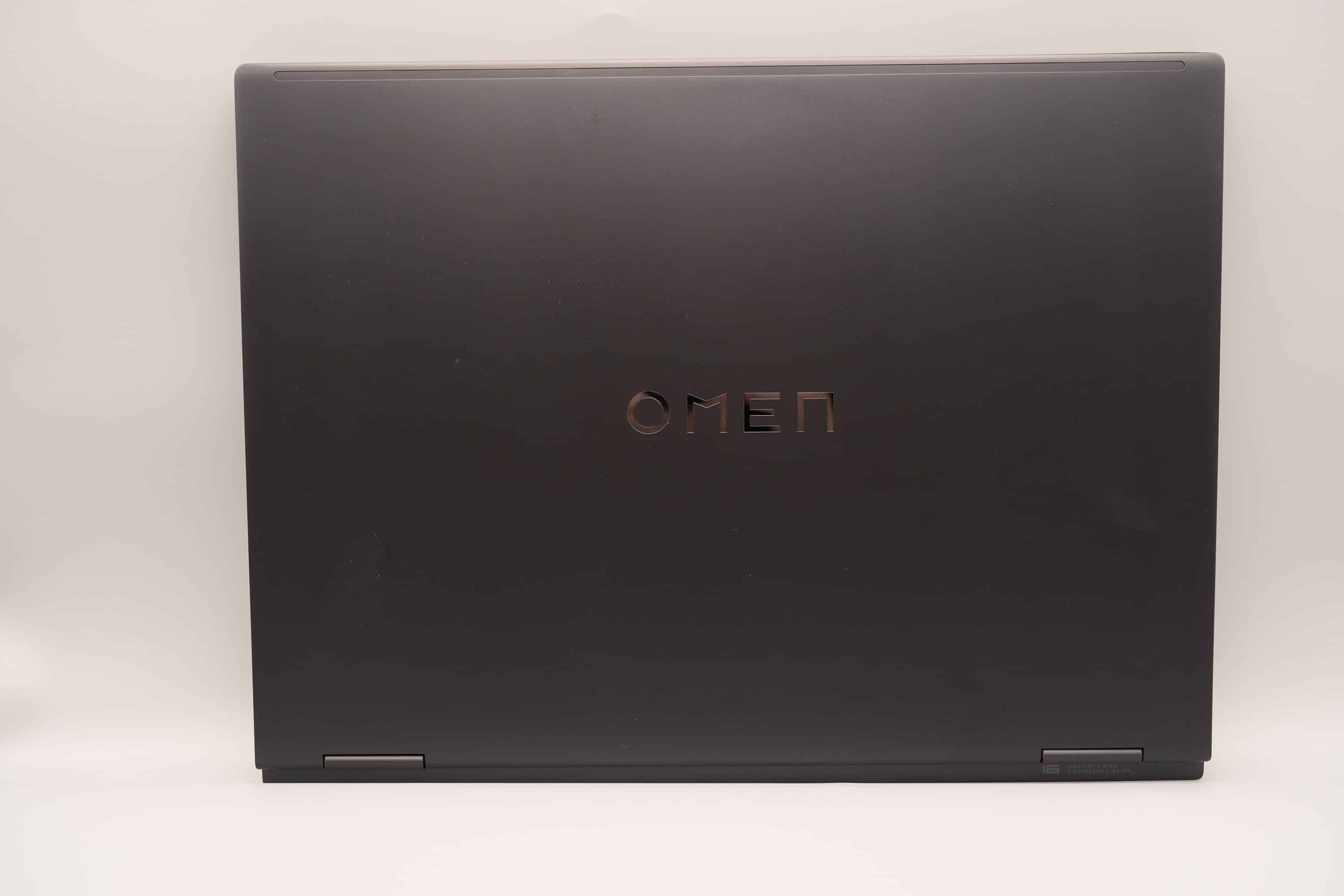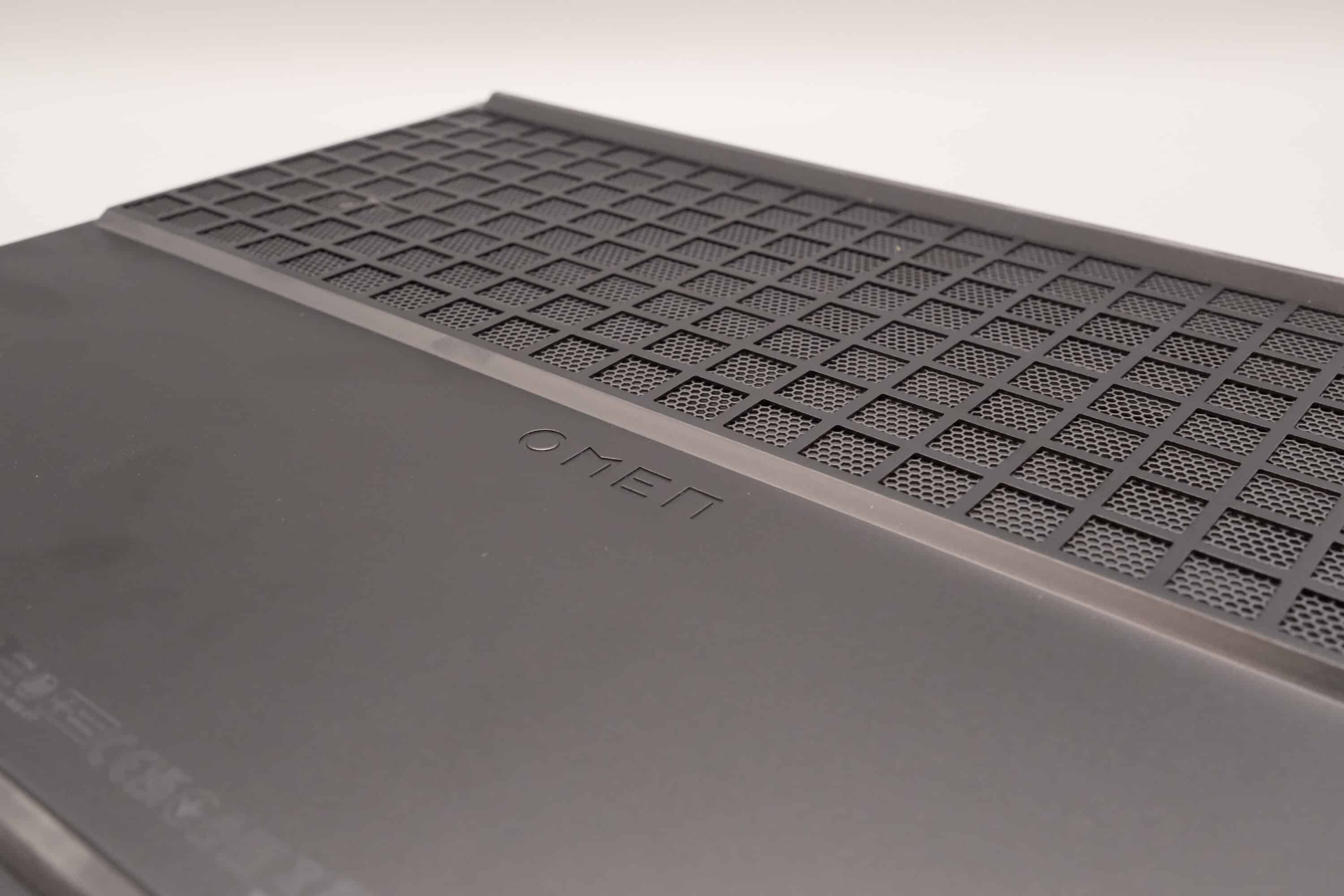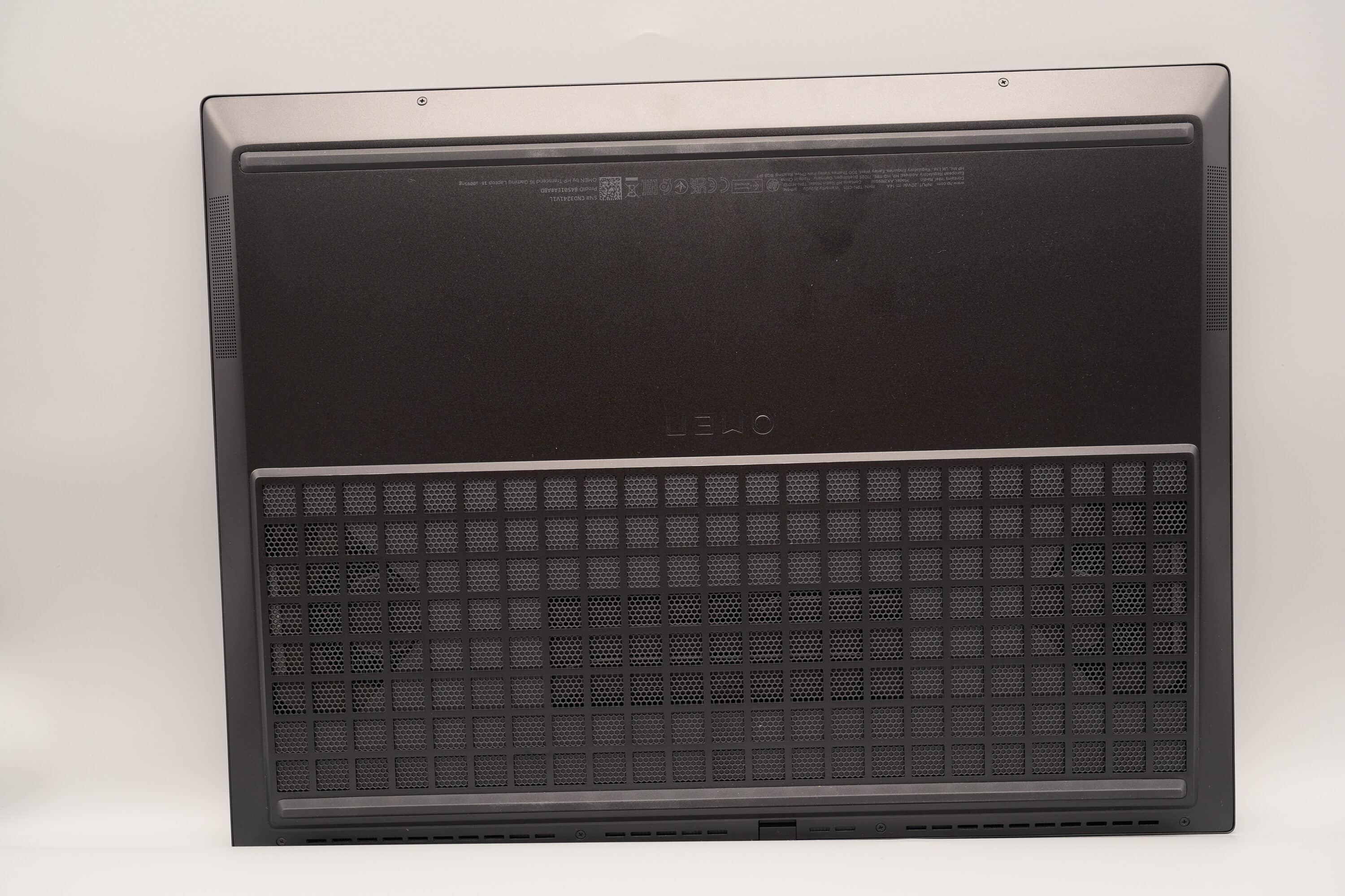 Das auffällige Omen-Logo auf dem Displaydeckel ist in diesem Fall aber einem schlichteren Schriftzug gewichen, während das Notebook nach vorne hin etwas keilförmig zuläuft. Für eine effektive Kühlung sorgen großzügige Schlitze, die sich fast über die gesamte Rückseite sowie beide Seiten des Laptops erstrecken.