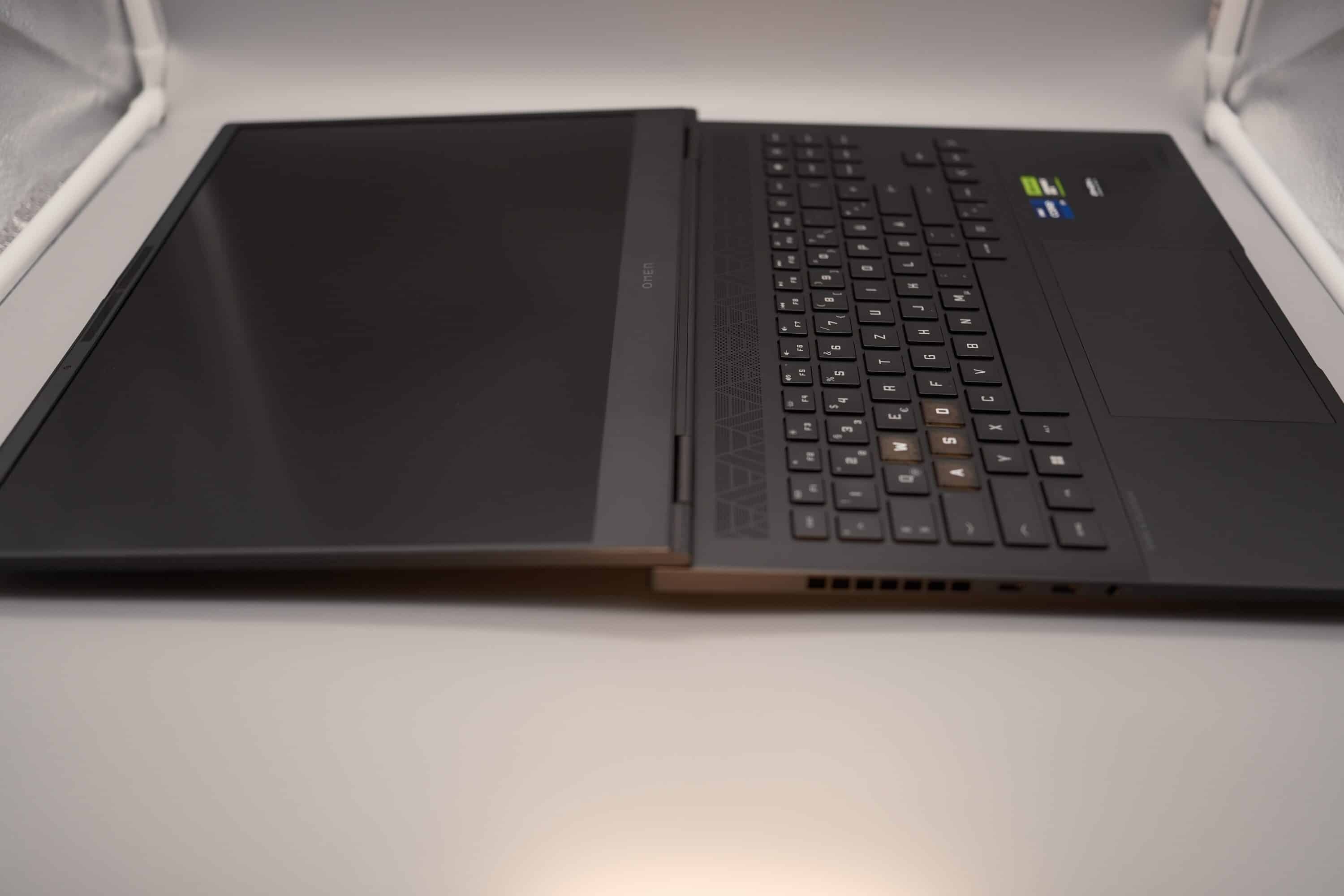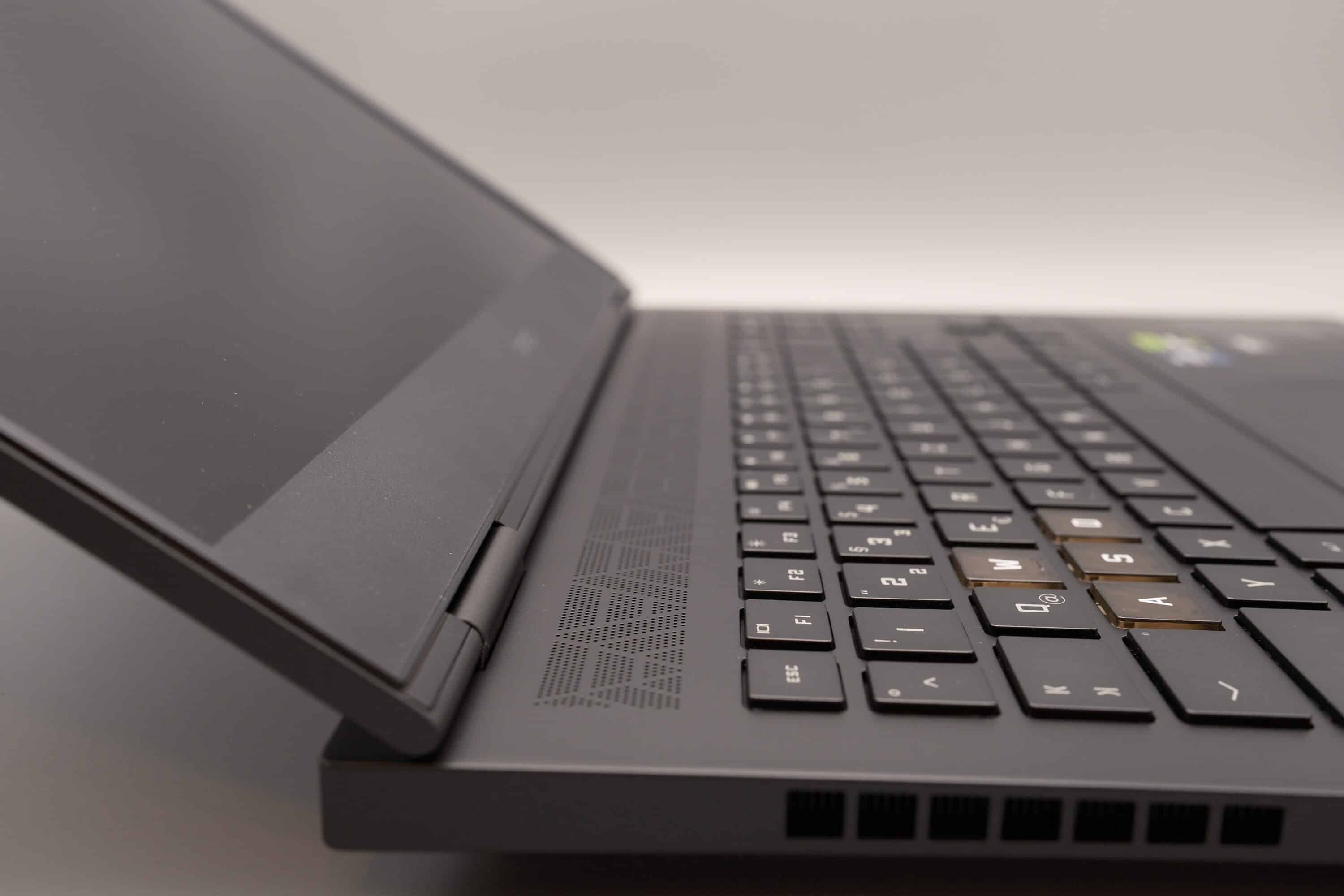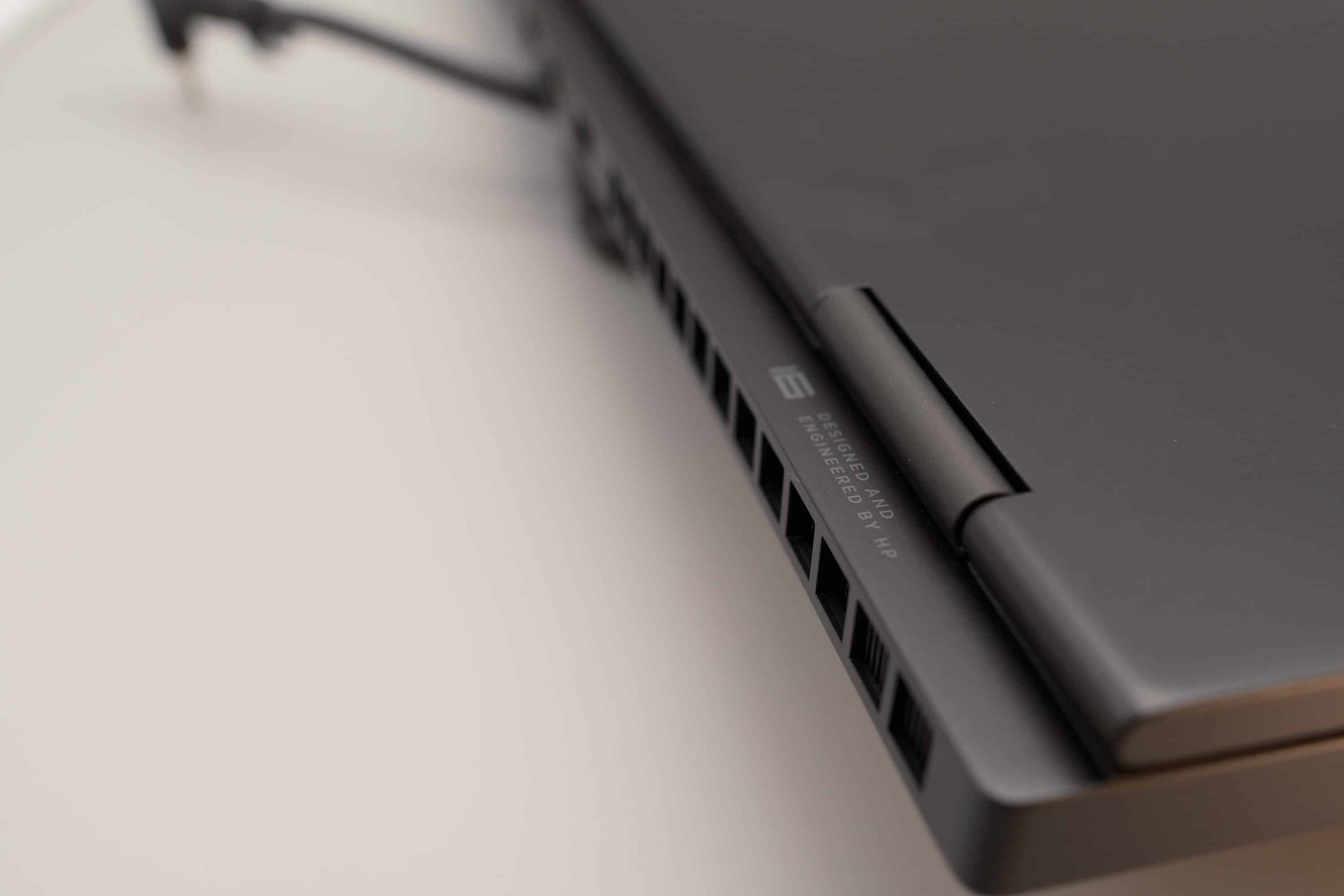 Das auffällige Omen-Logo auf dem Displaydeckel ist in diesem Fall aber einem schlichteren Schriftzug gewichen, während das Notebook nach vorne hin etwas keilförmig zuläuft. Für eine effektive Kühlung sorgen großzügige Schlitze, die sich fast über die gesamte Rückseite sowie beide Seiten des Laptops erstrecken.