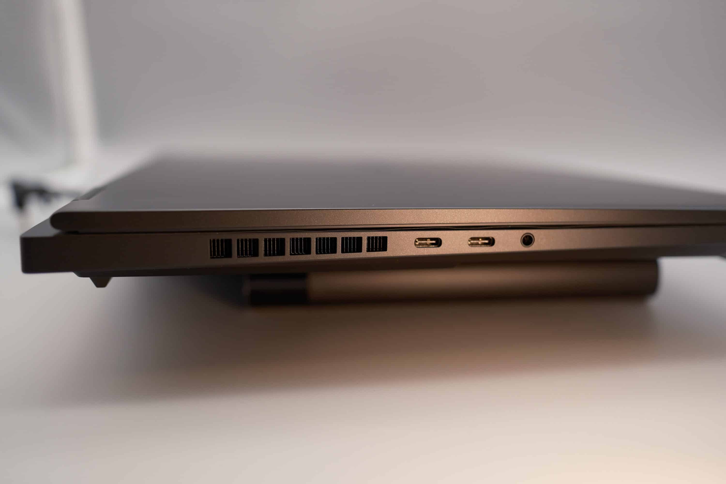 Hervorragend fällt zudem die Anschlussvielfalt des HP OMEN Transcend 16-u0095ng aus, die der Hersteller nicht nur auf die beiden Seiten sondern auch auf die Rückseite verteilt. Hinten sitzen vor allem die Ports, die im stationären Betrieb fast immer verbunden sind: